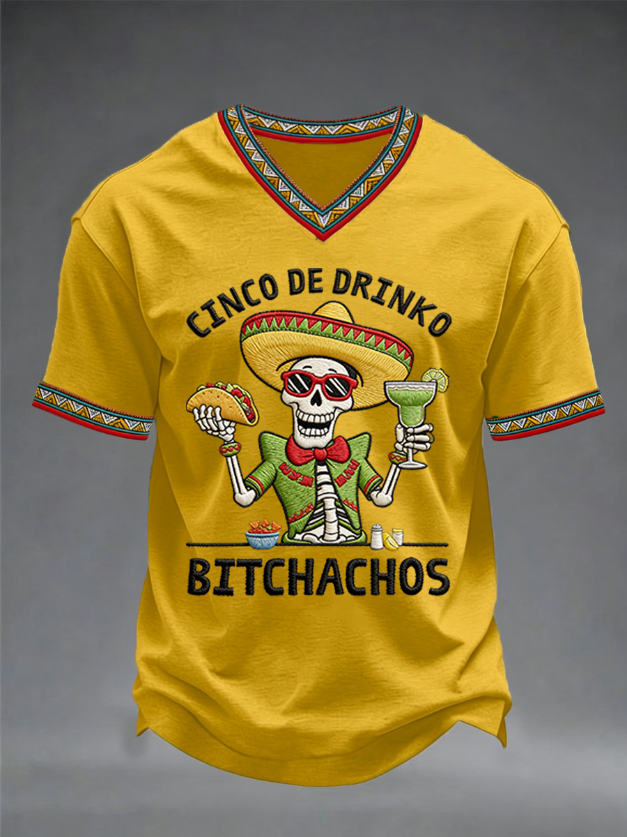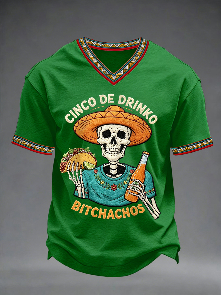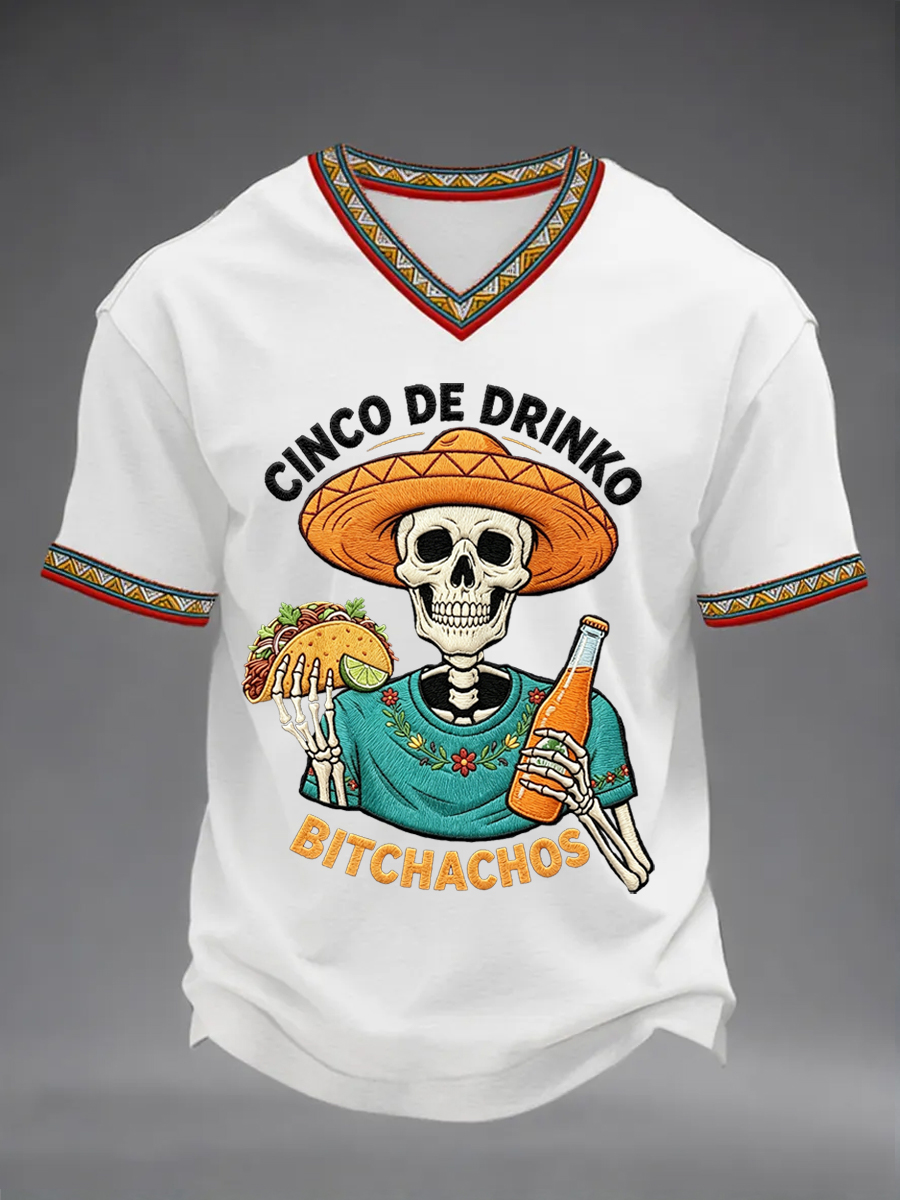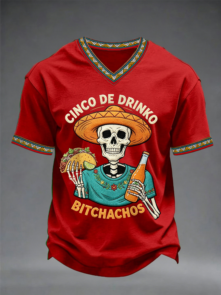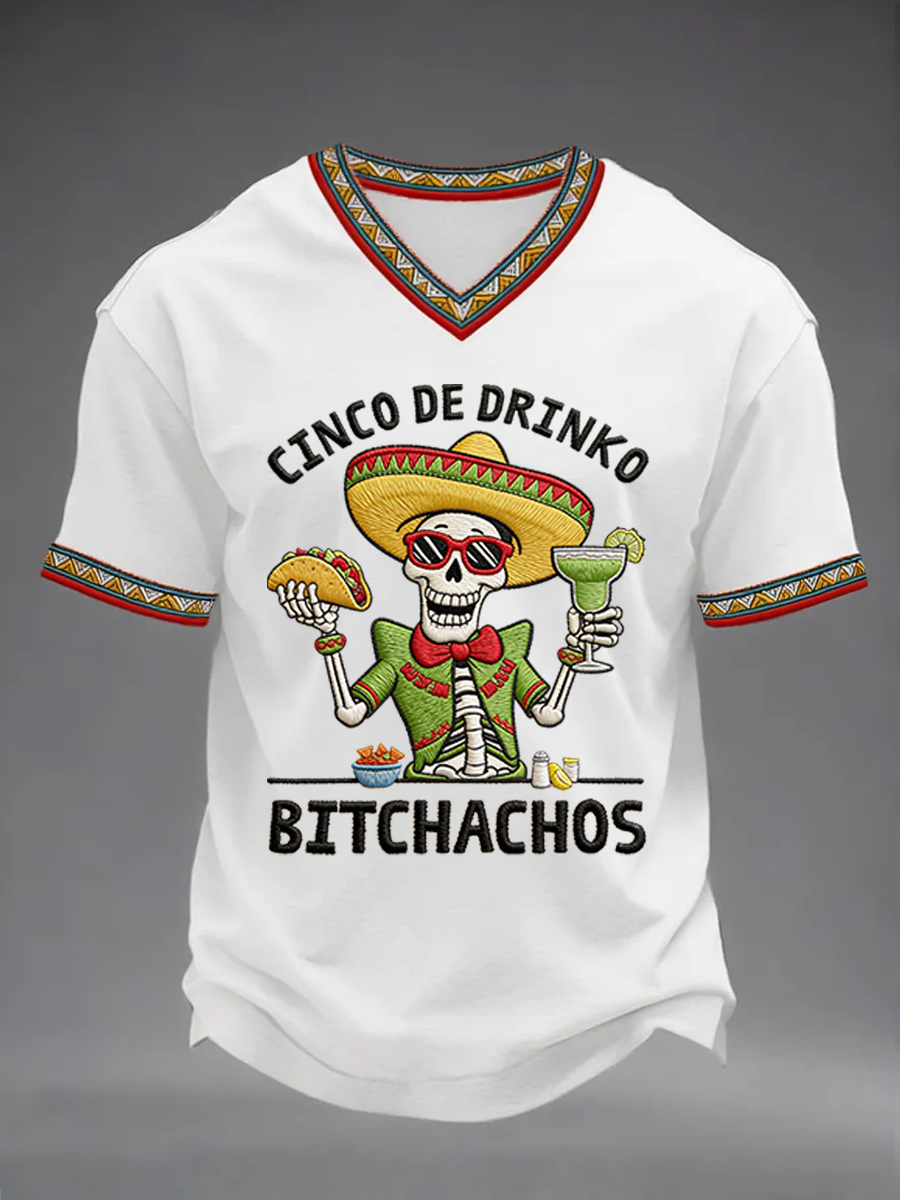 Men's Funny Cinco De Drinko Bitchachos Skeleton Print Casual V-Neck Tee