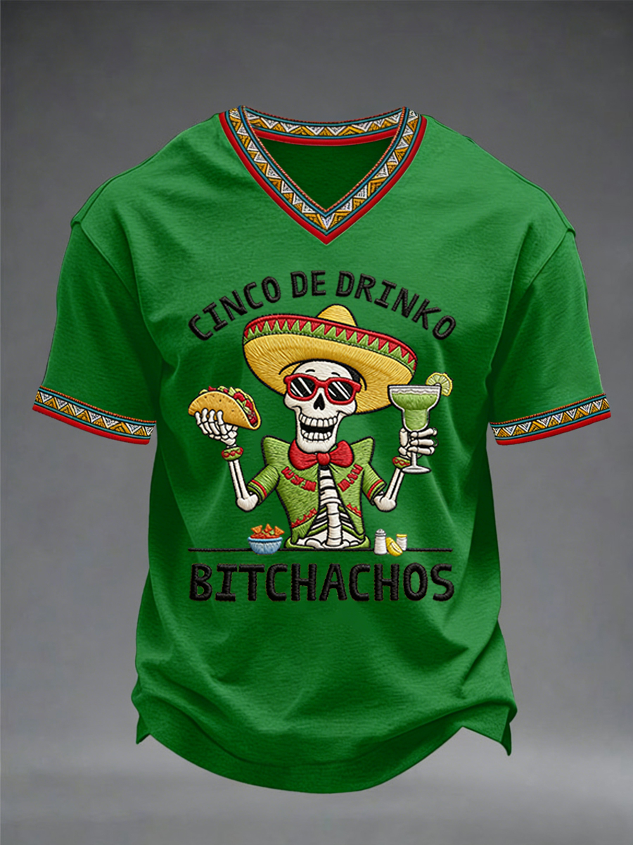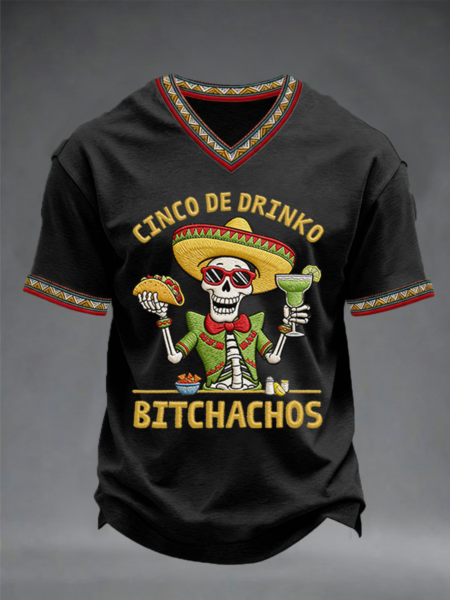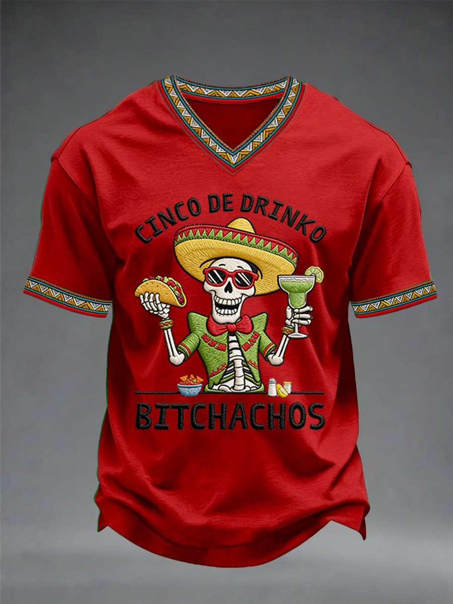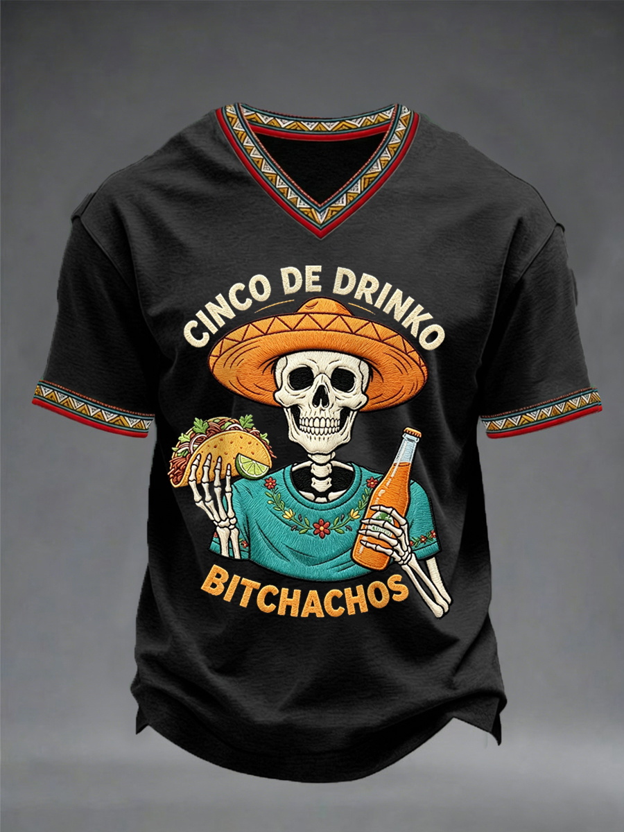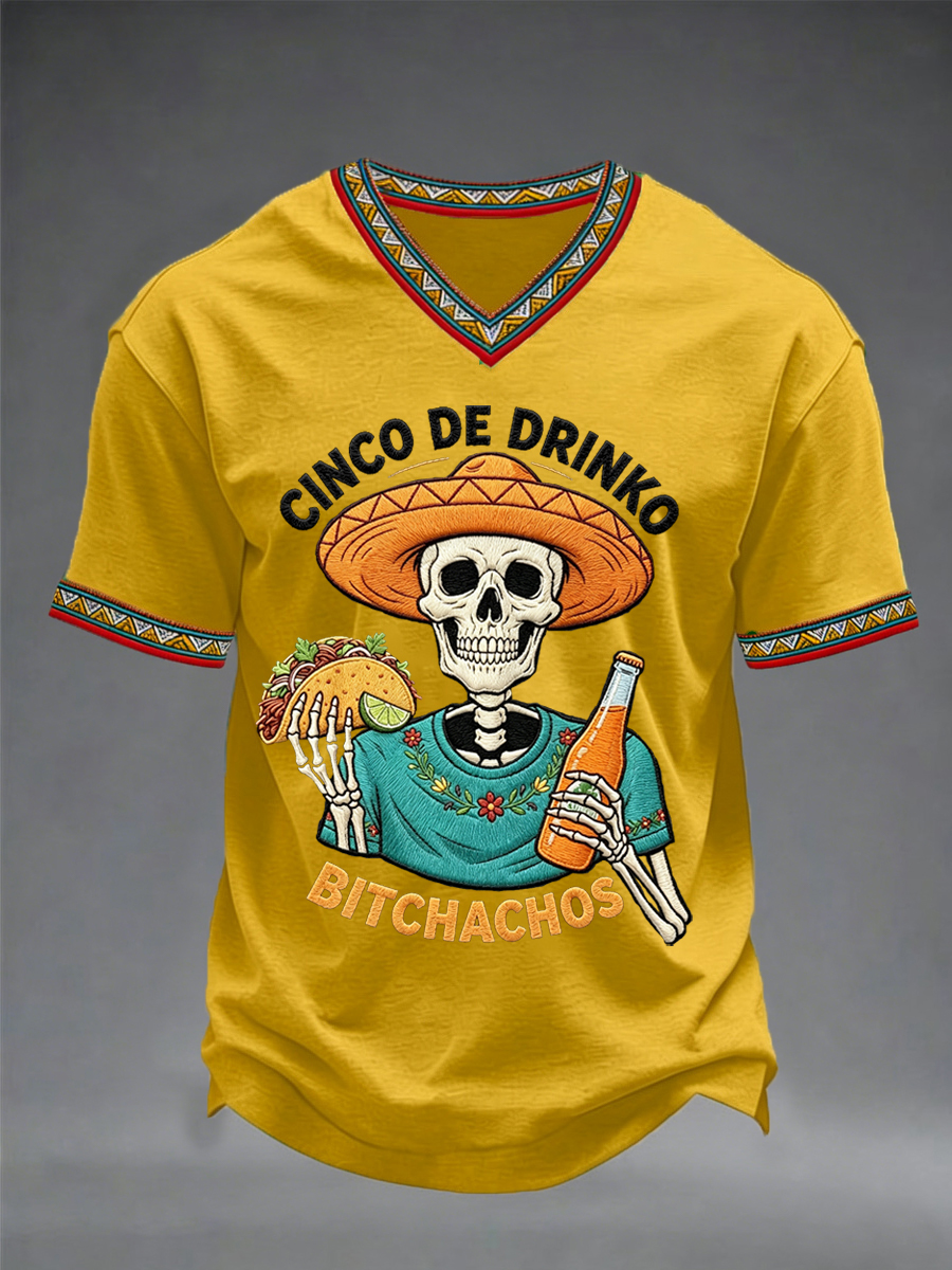 Men's Funny Cinco De Drinko Bitchachos Skeleton Print Casual V-Neck Tee