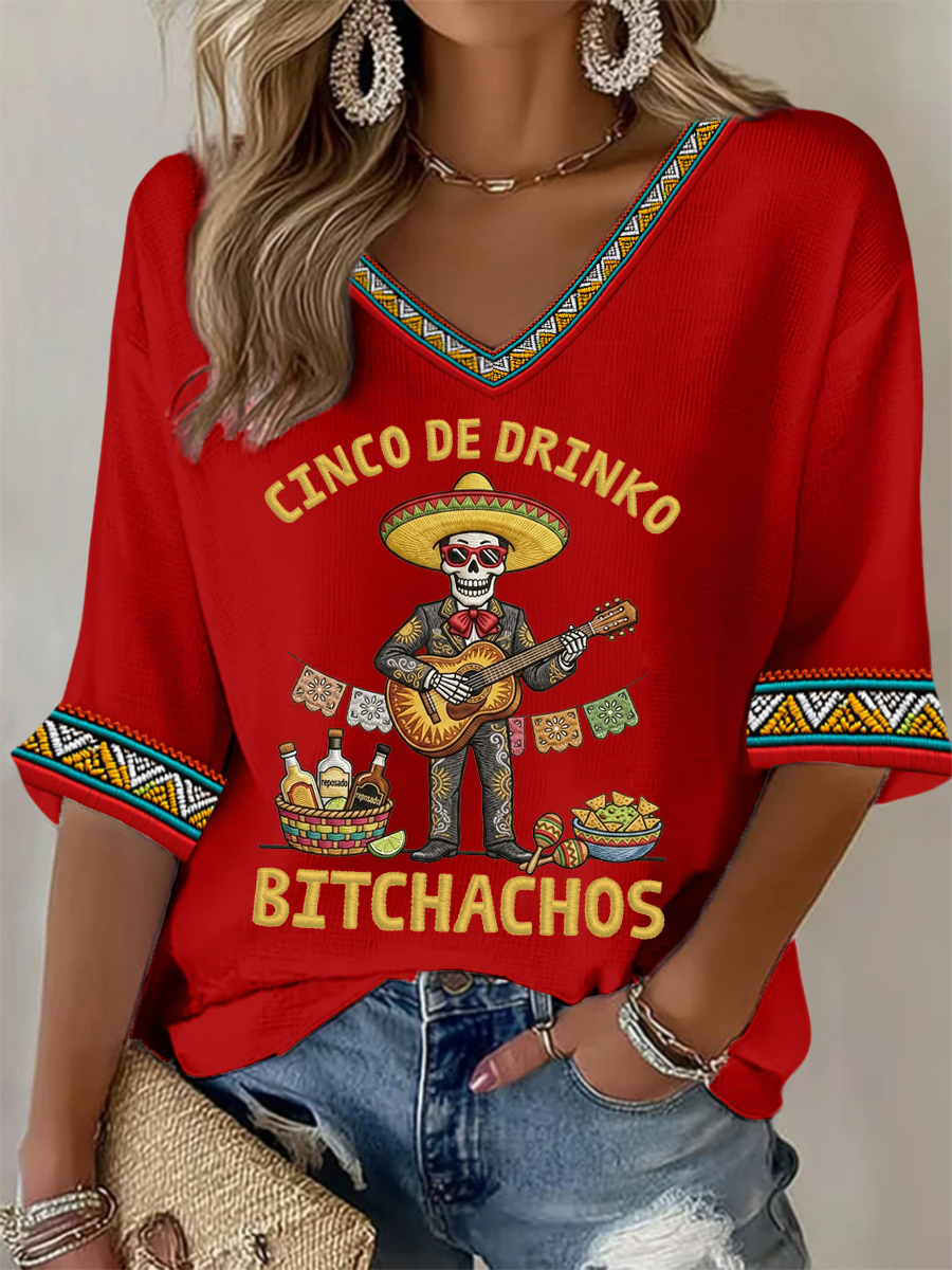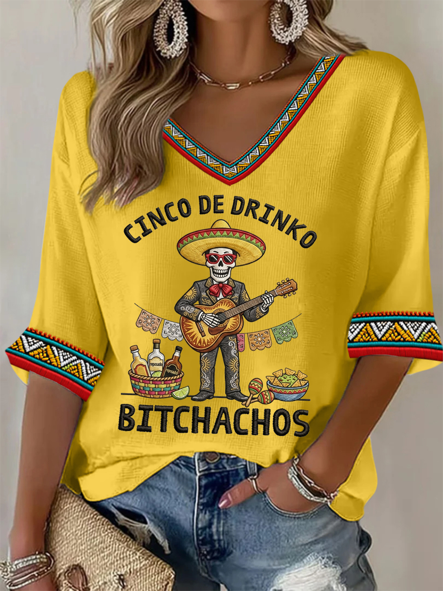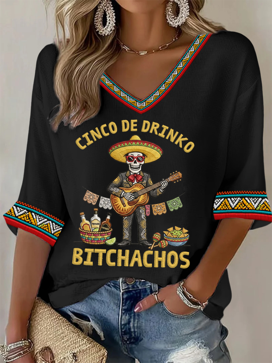 Women's Funny Cinco De Drinko Bitchachos Skeleton Print Casual Waffle Top