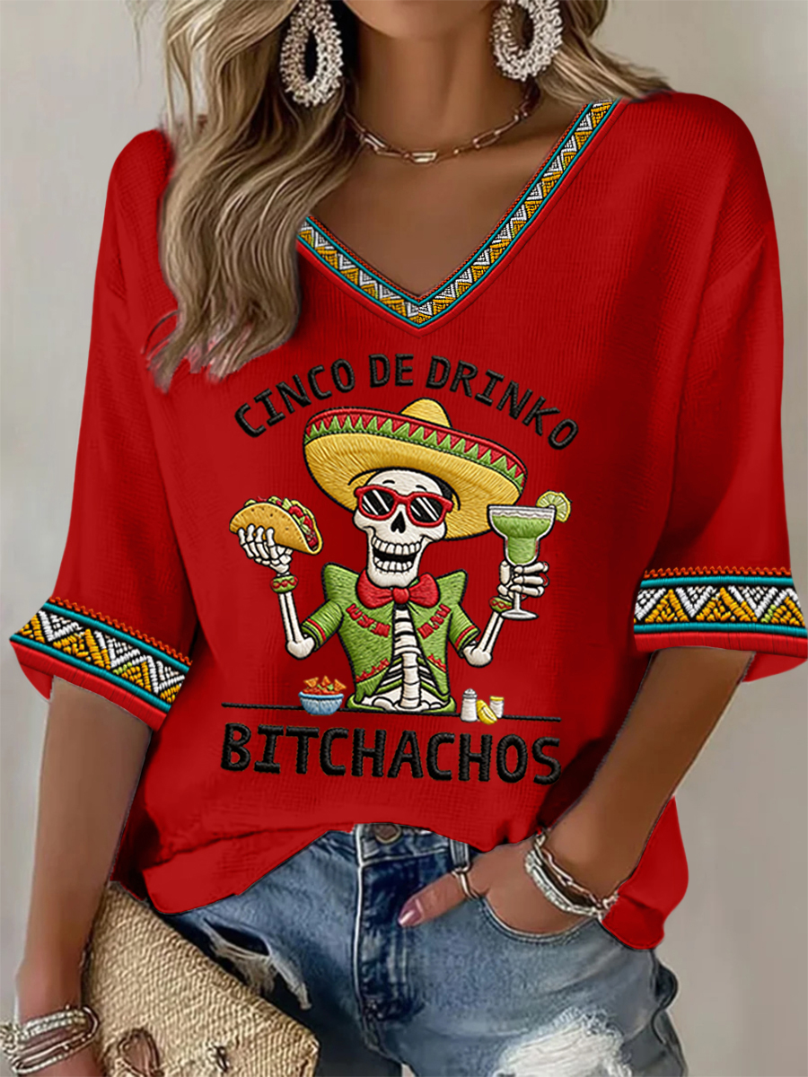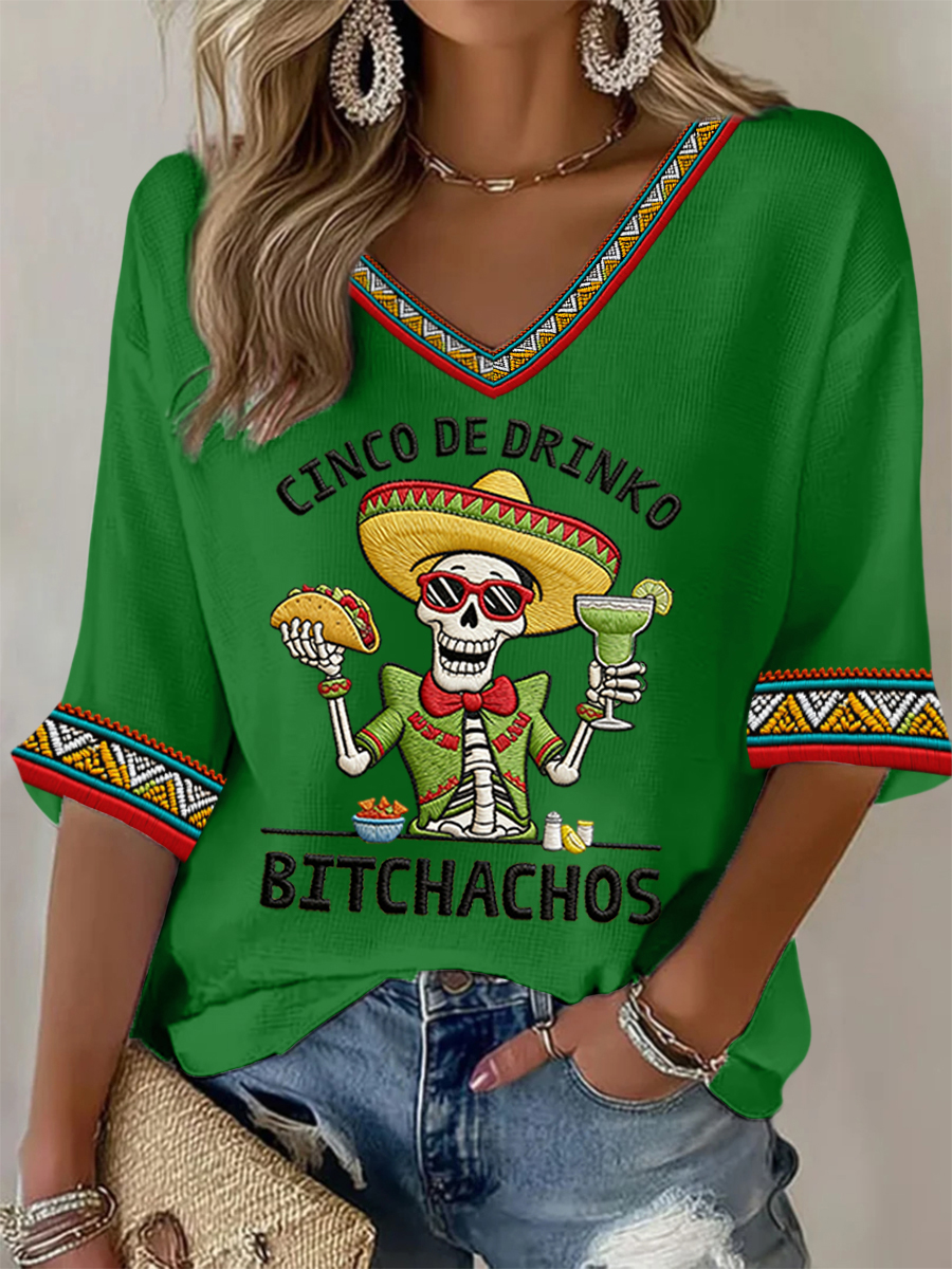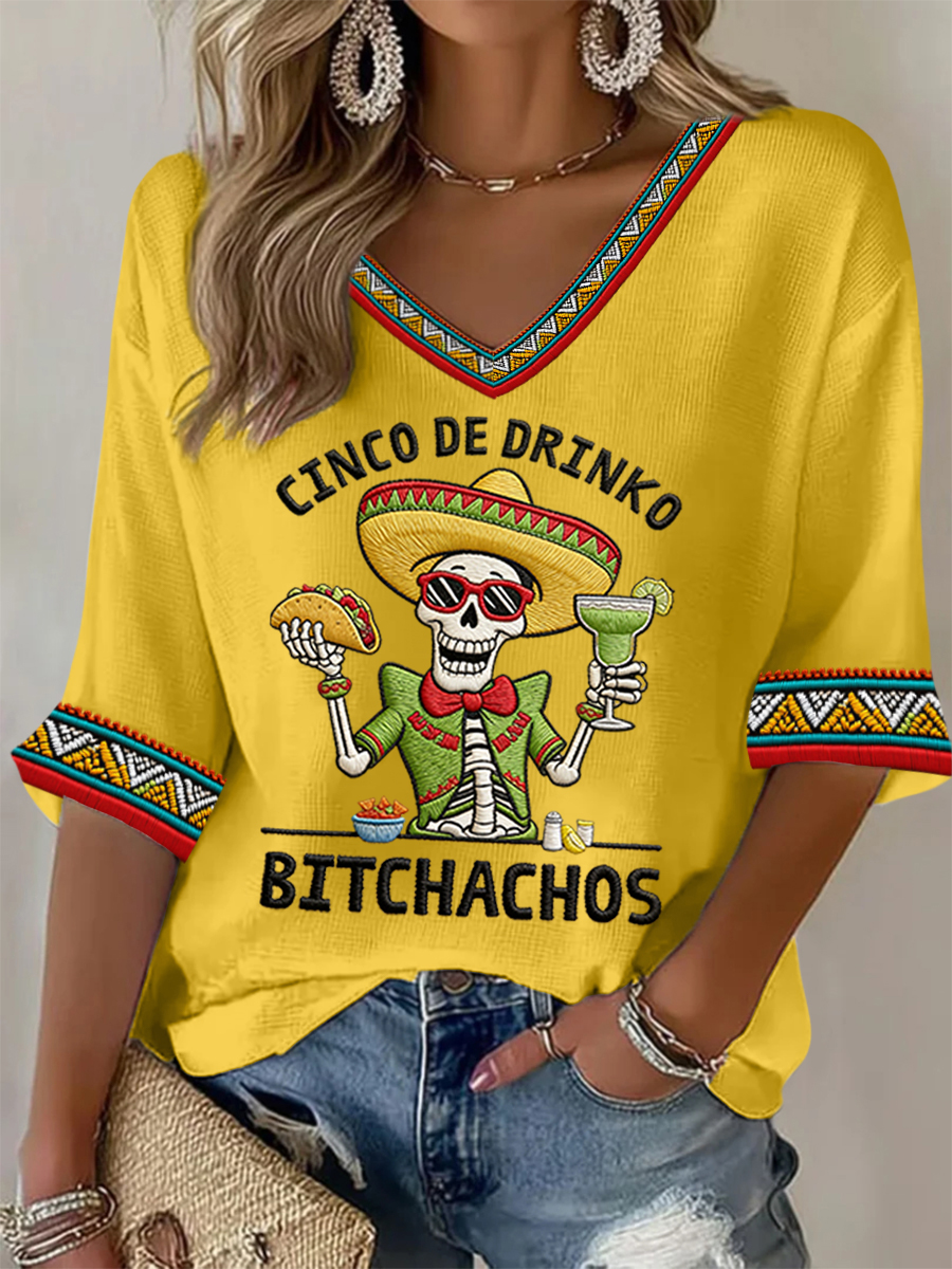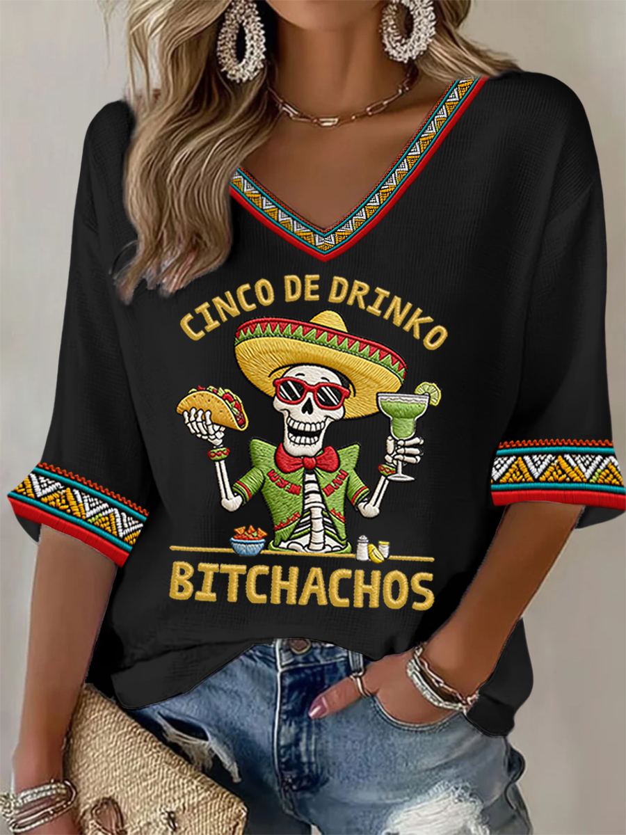 Women's Funny Cinco De Drinko Bitchachos Skeleton Print Casual Waffle Top