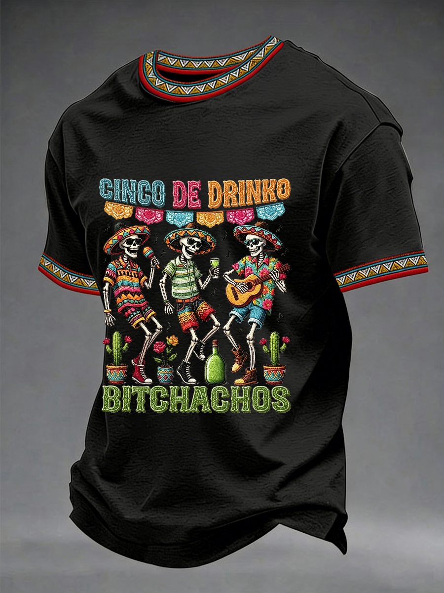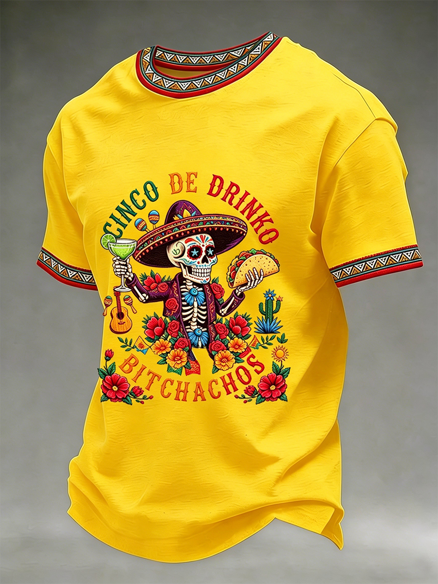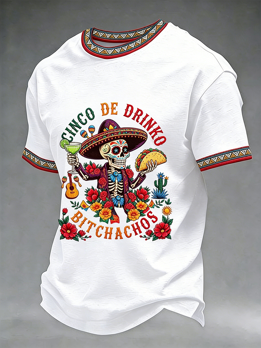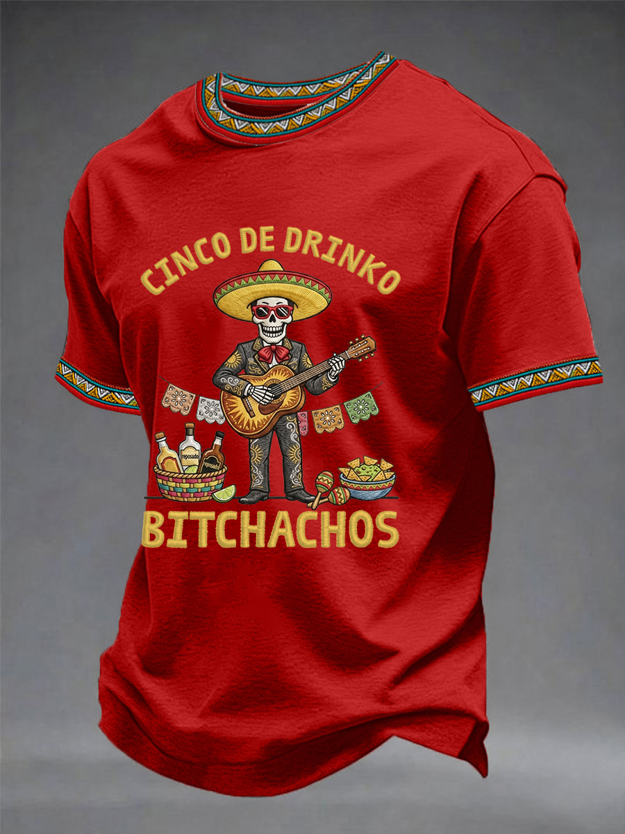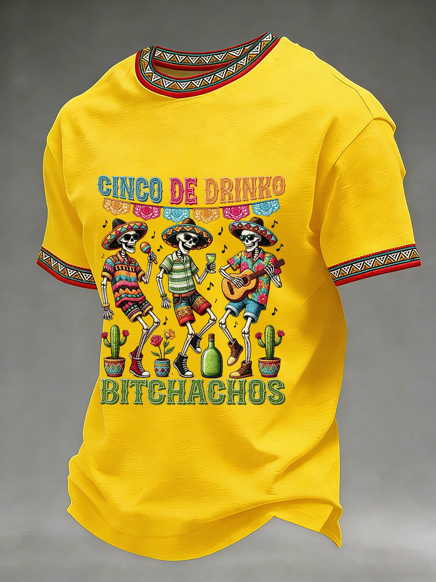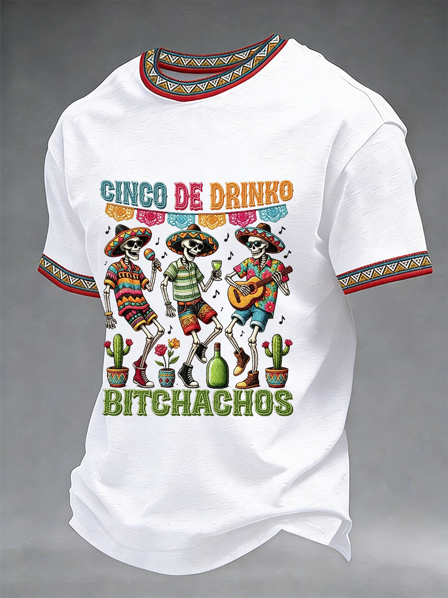 Men's Funny Cinco De Drinko Bitchachos Skeleton Print Casual Short-Sleeve T-shirt