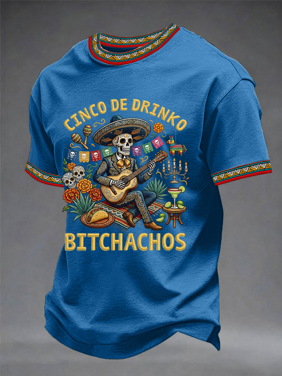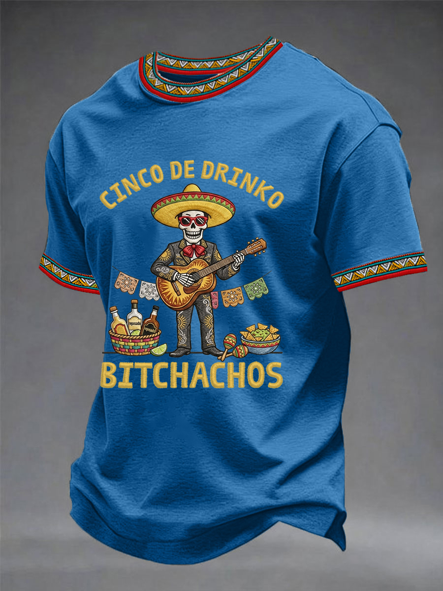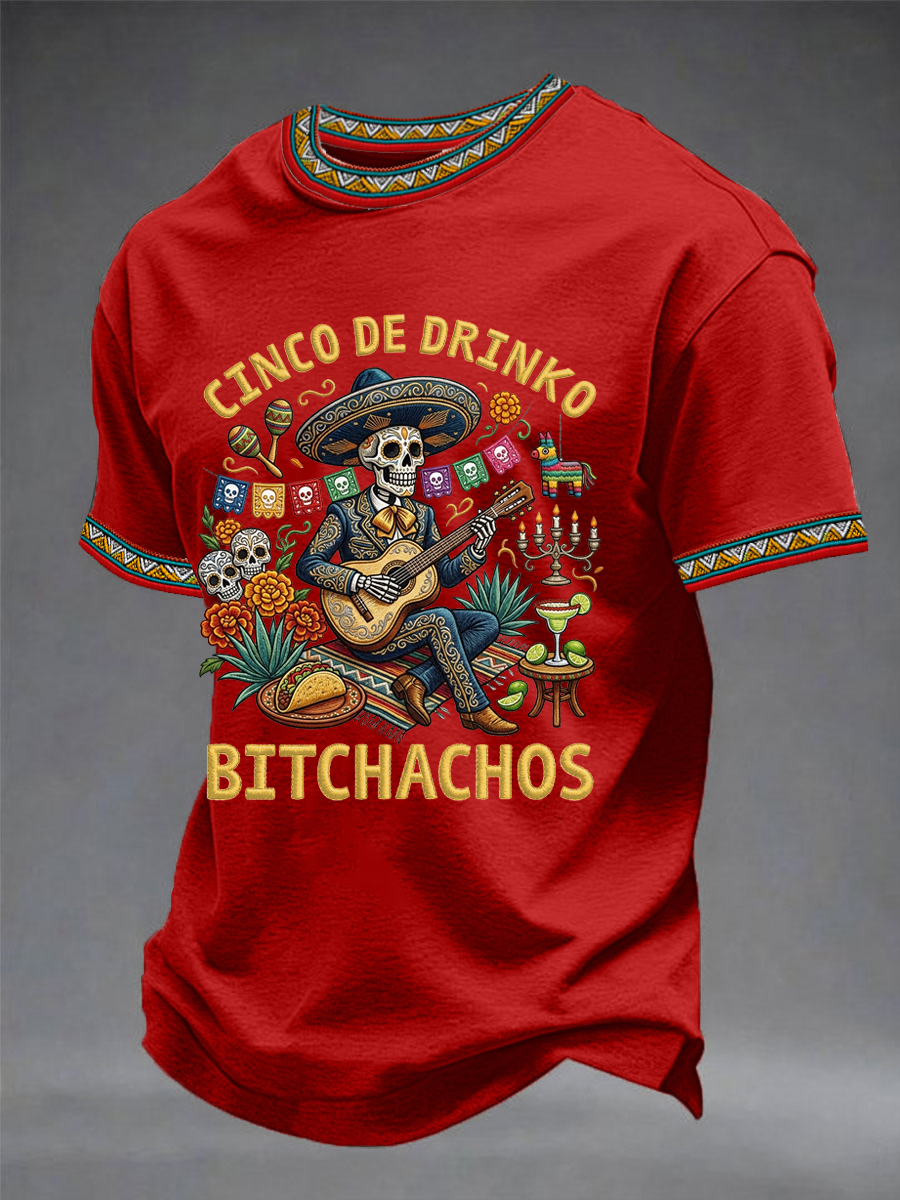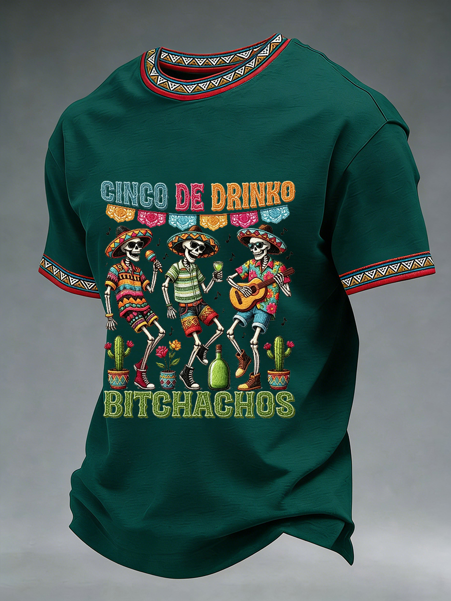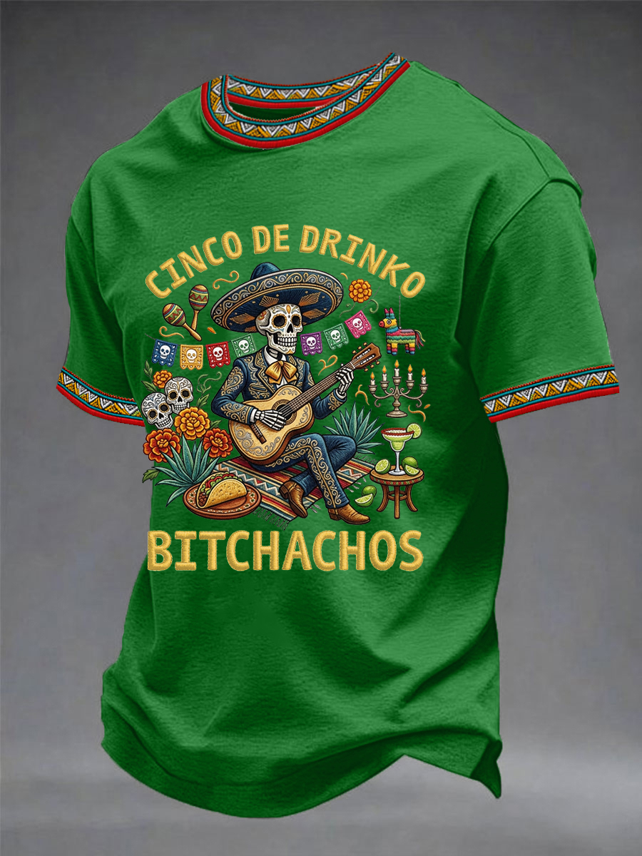 Men's Funny Cinco De Drinko Bitchachos Skeleton Print Casual Short-Sleeve T-shirt