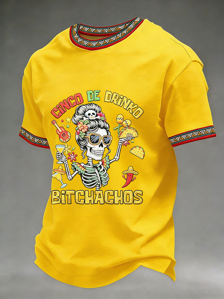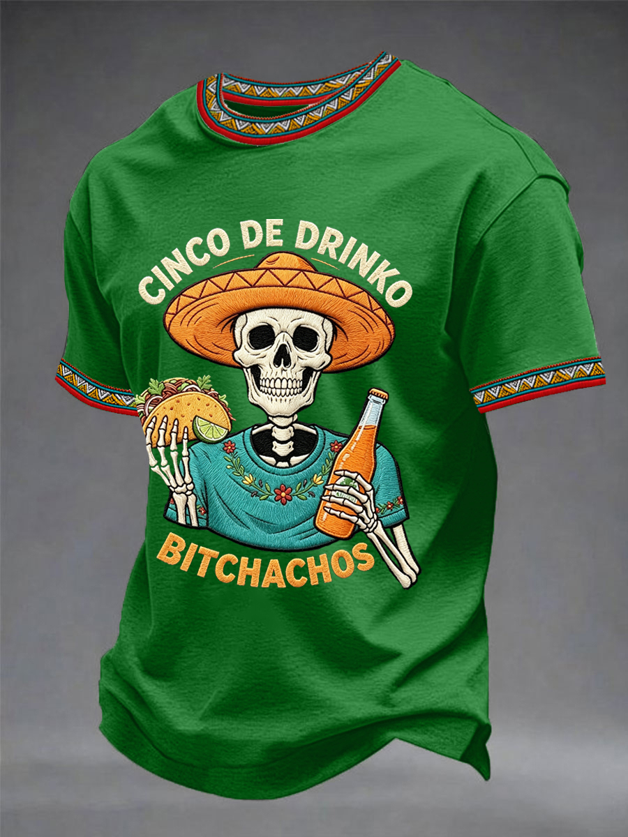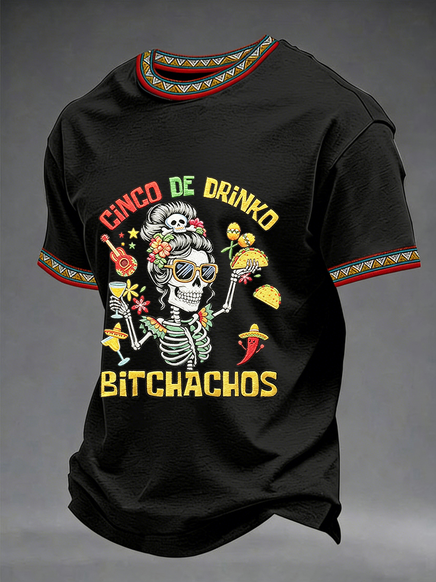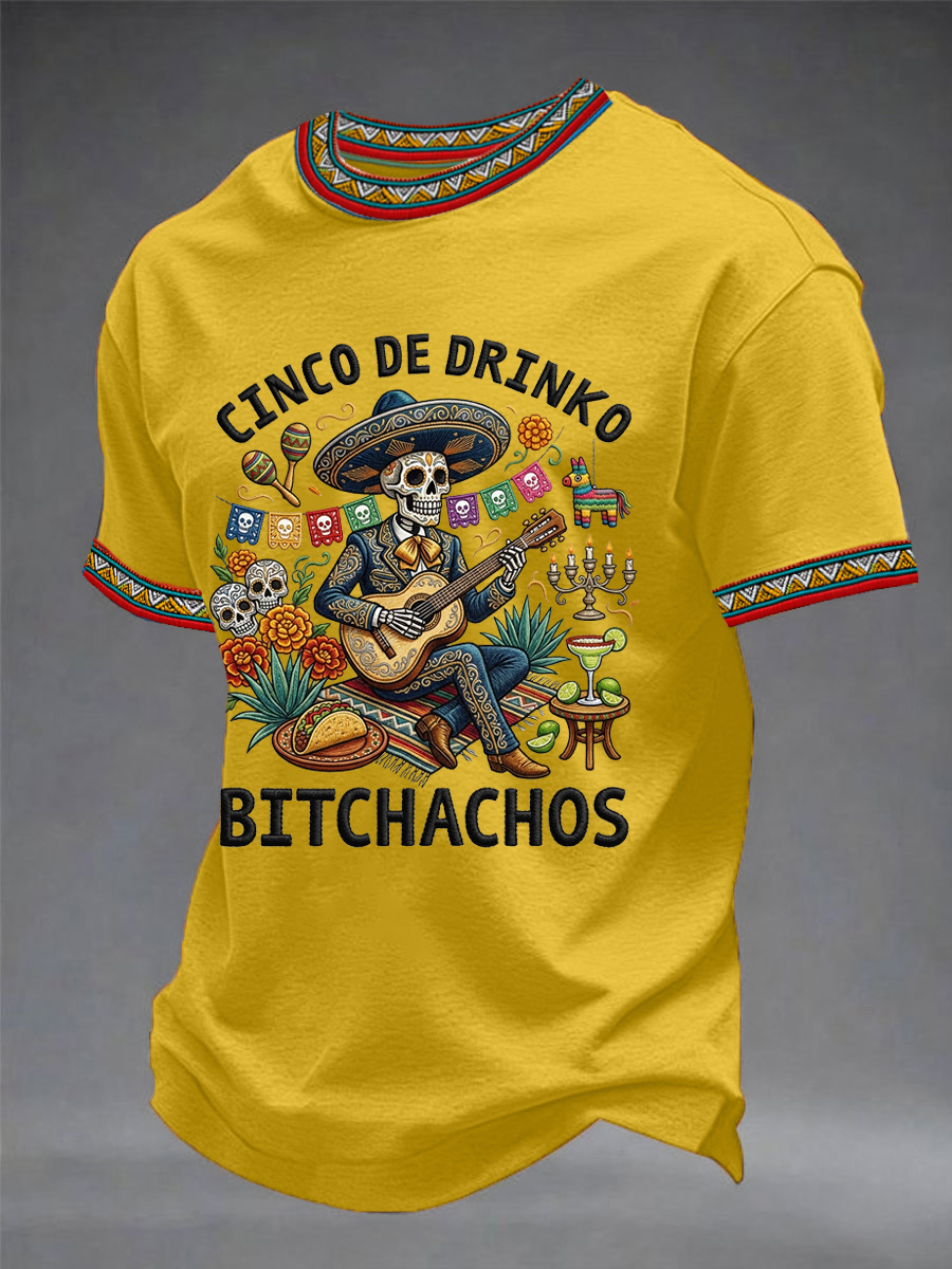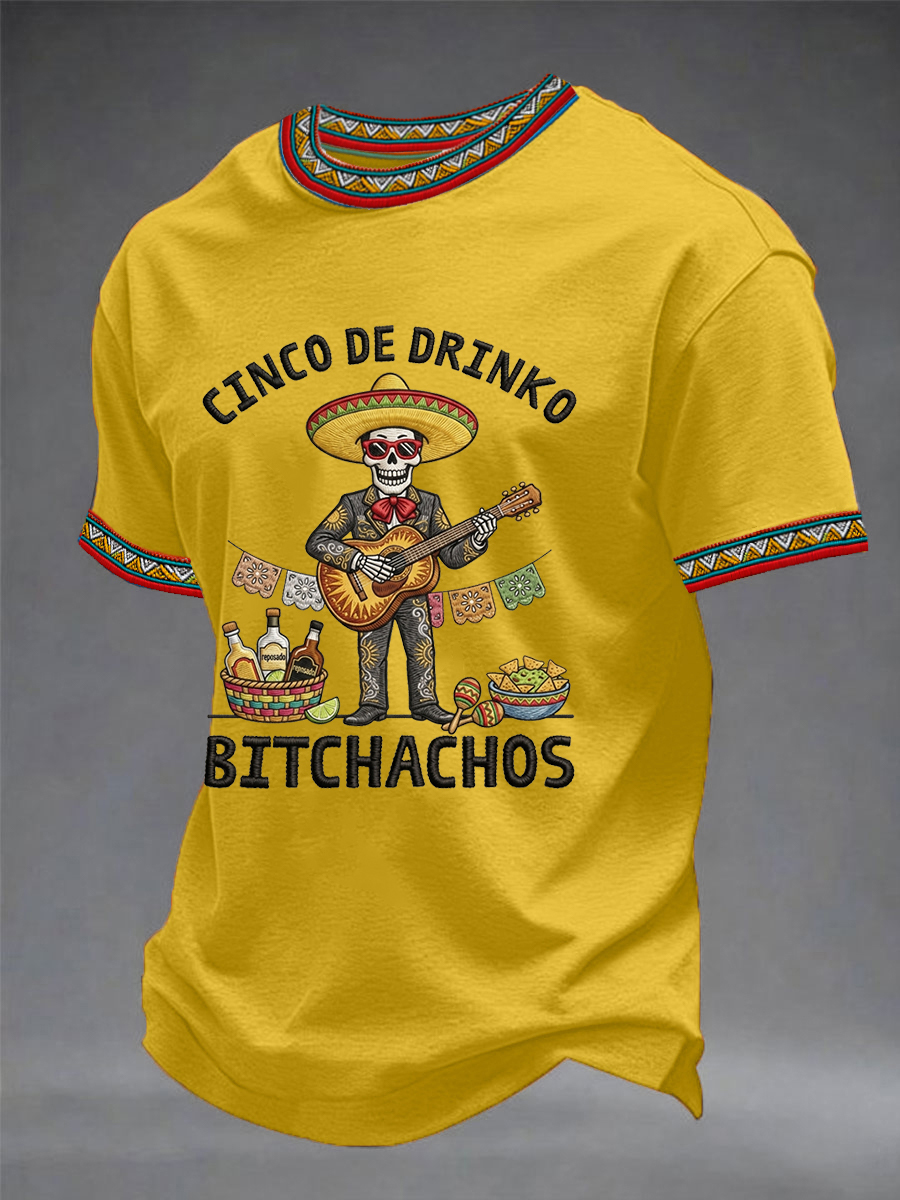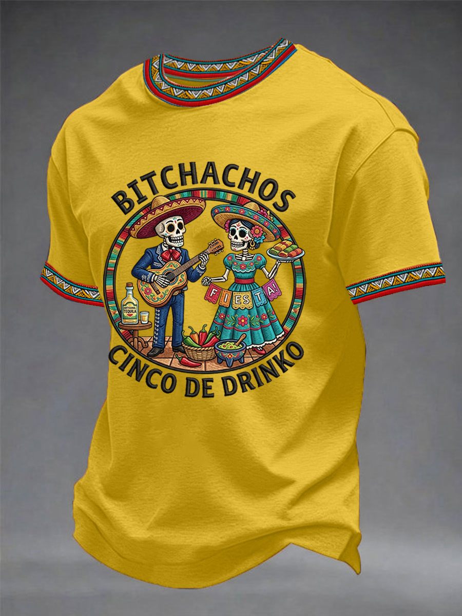 Men's Funny Cinco De Drinko Bitchachos Skeleton Print Casual Short-Sleeve T-shirt