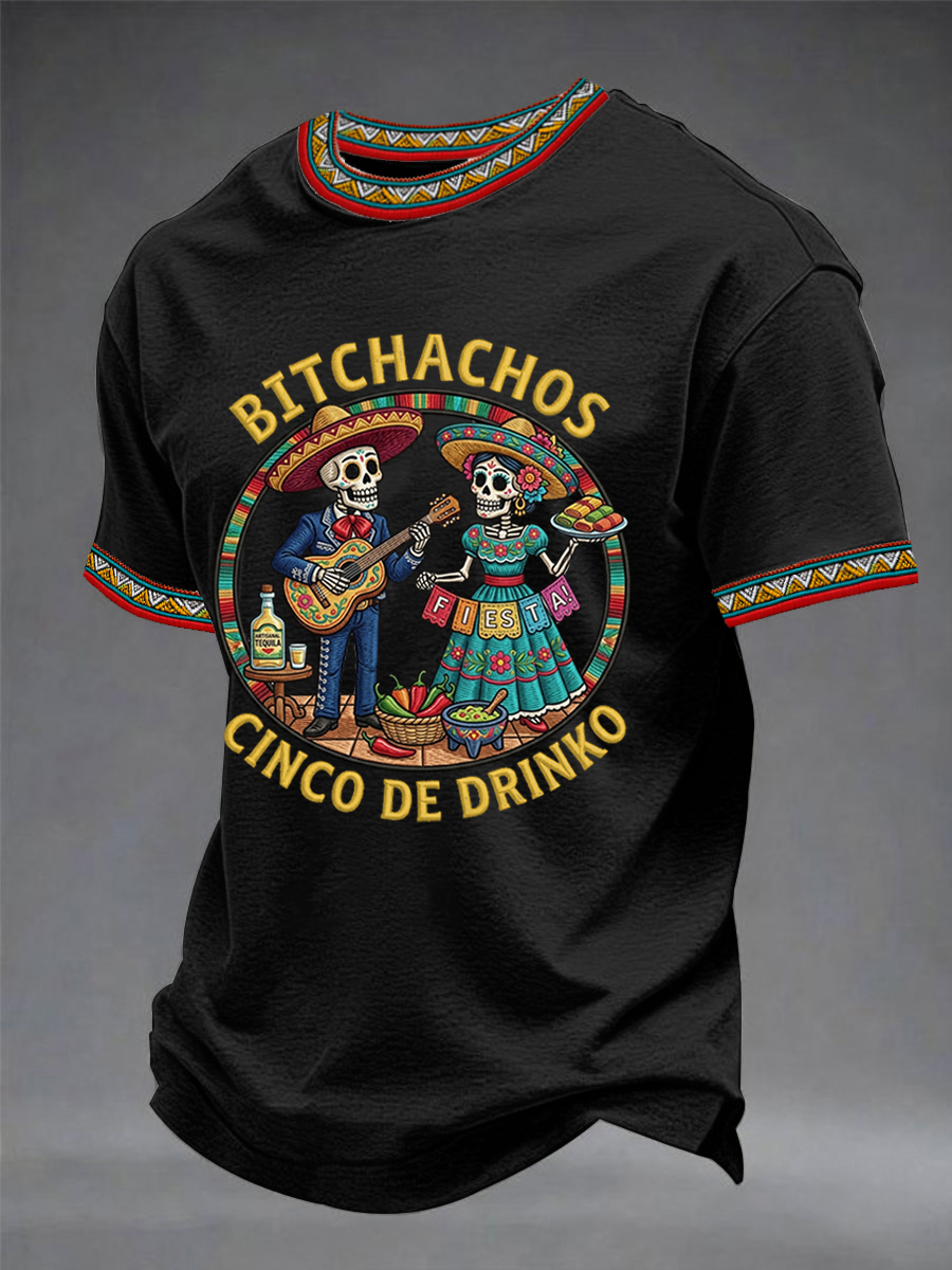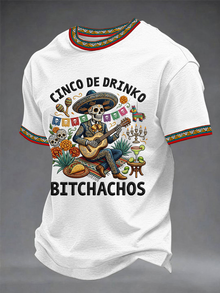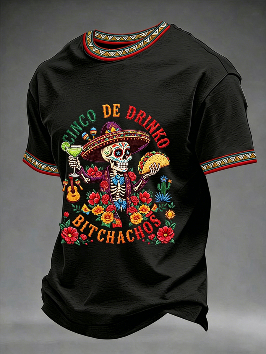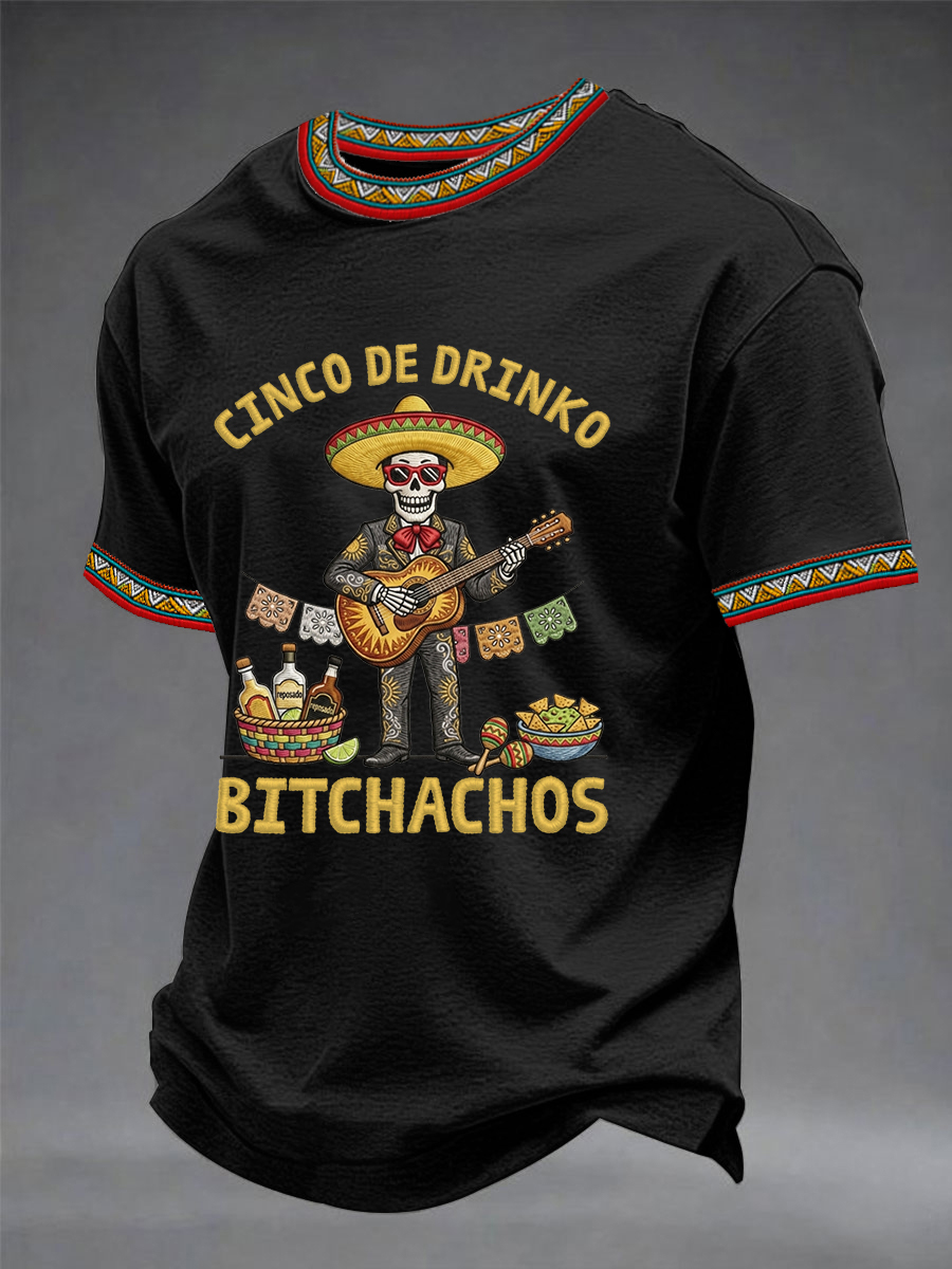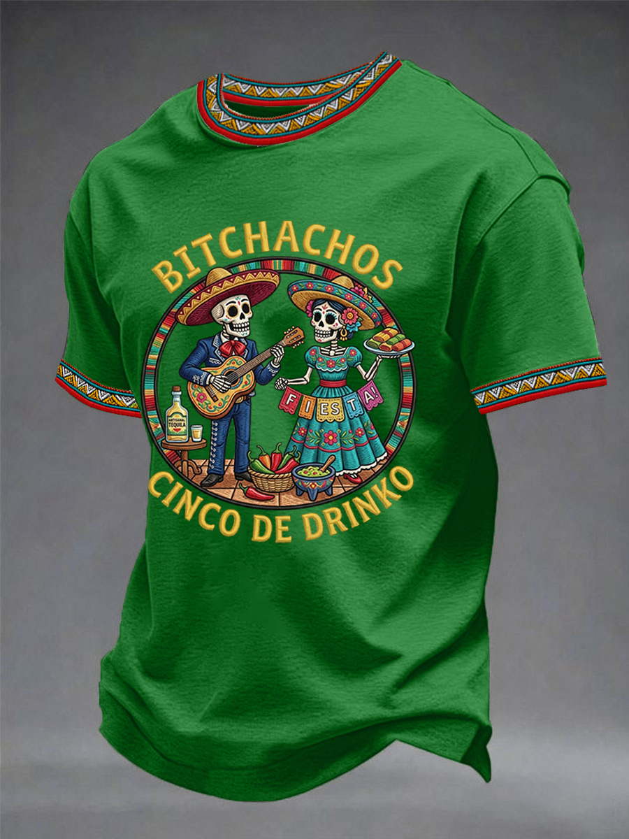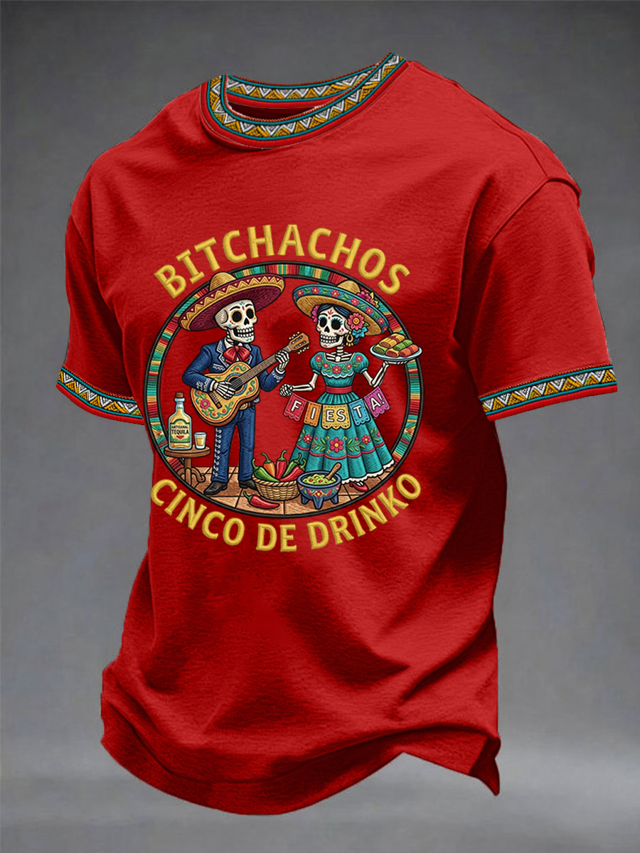 Men's Funny Cinco De Drinko Bitchachos Skeleton Print Casual Short-Sleeve T-shirt