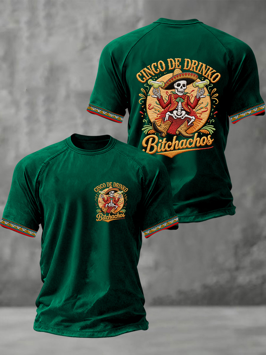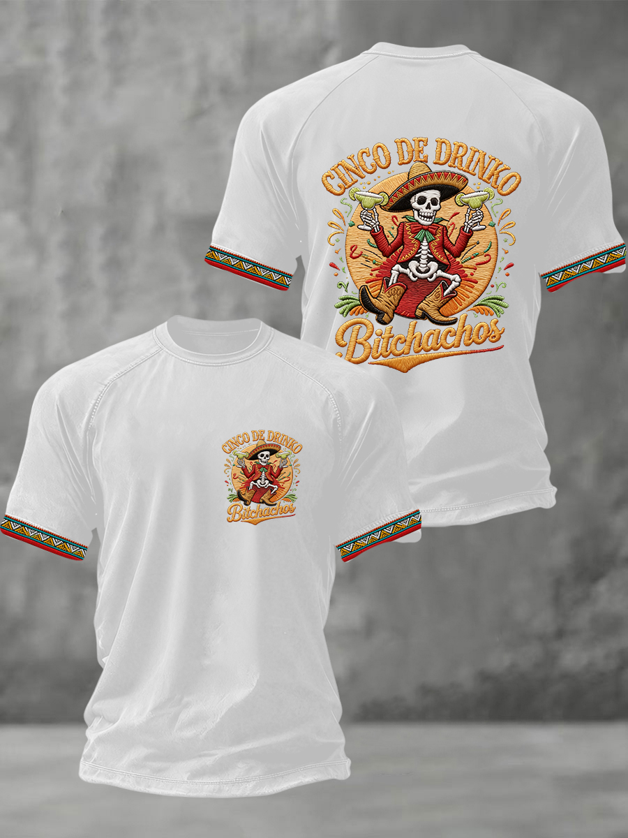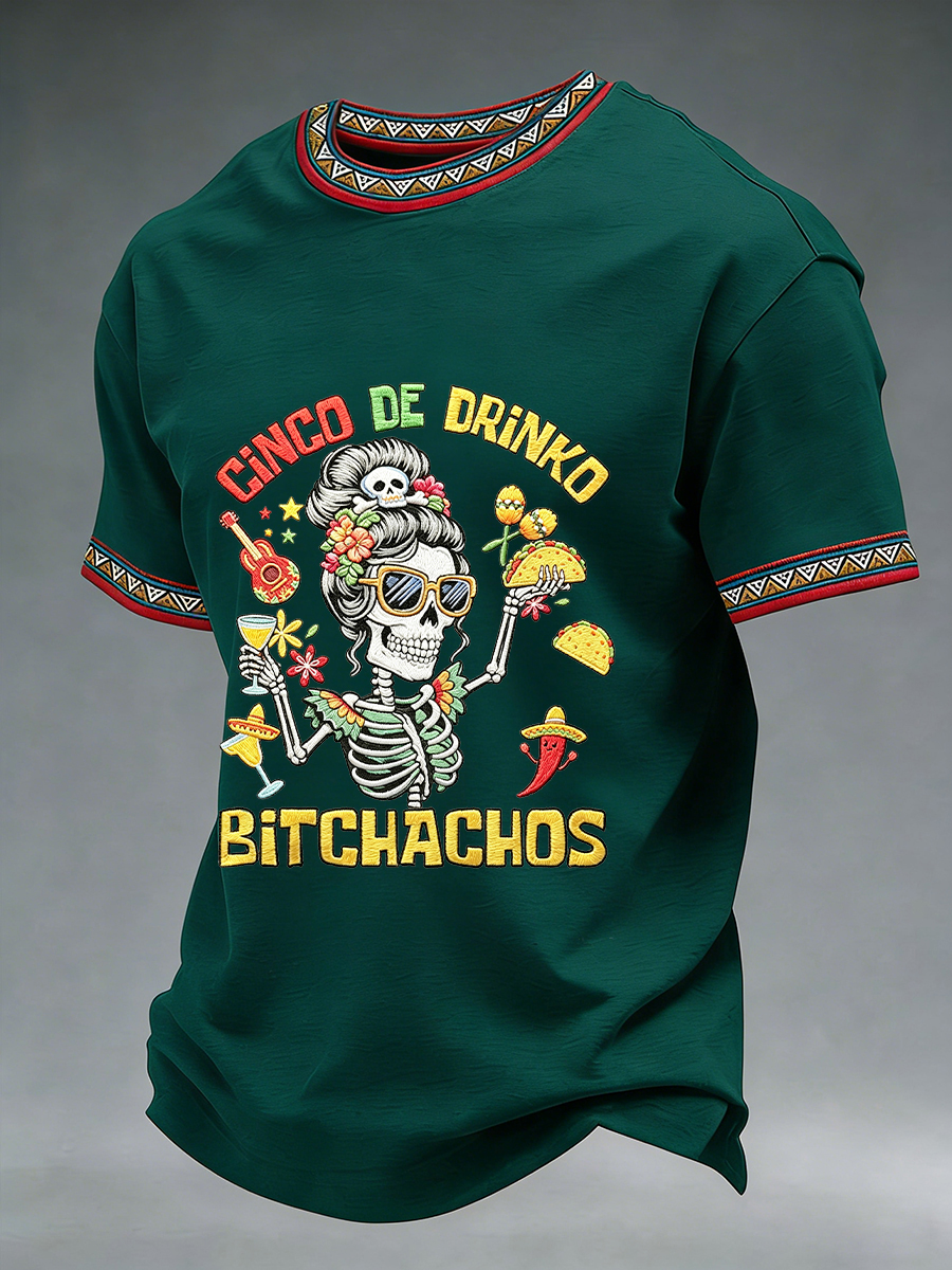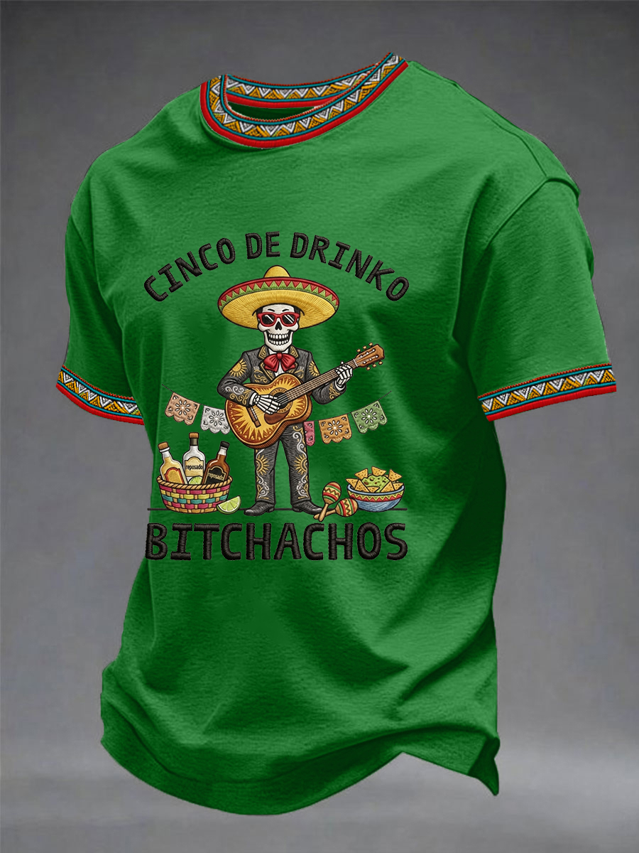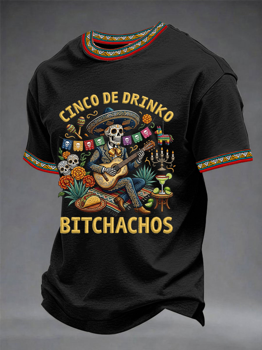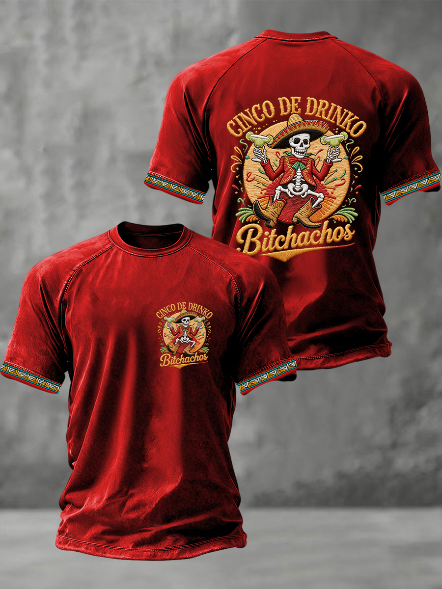 Men's Funny Cinco De Drinko Bitchachos Skeleton Print Casual Short-Sleeve T-shirt