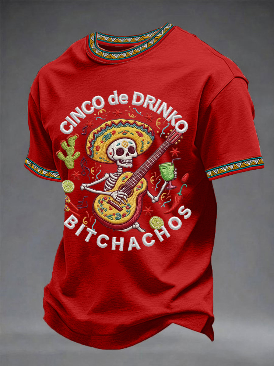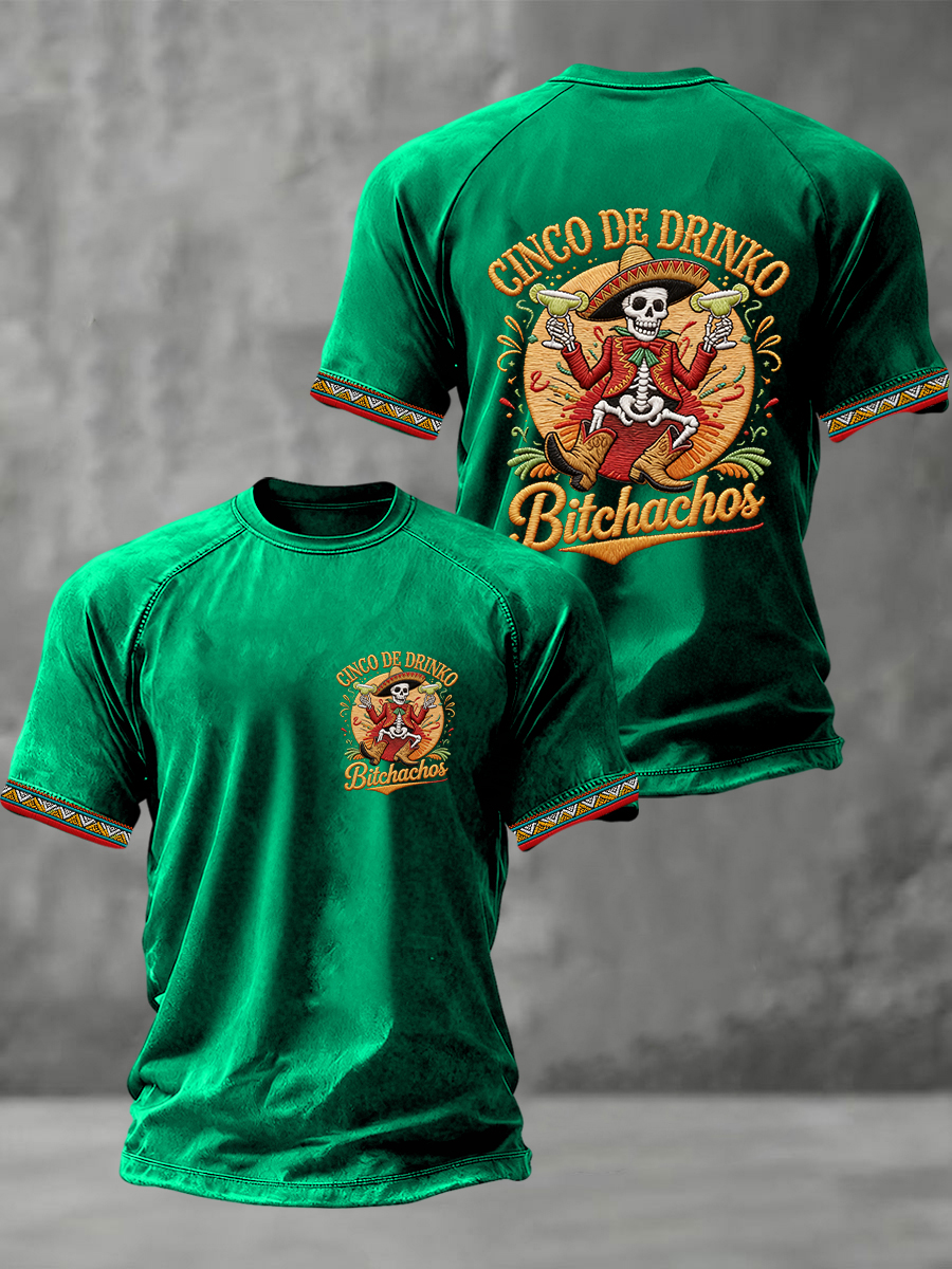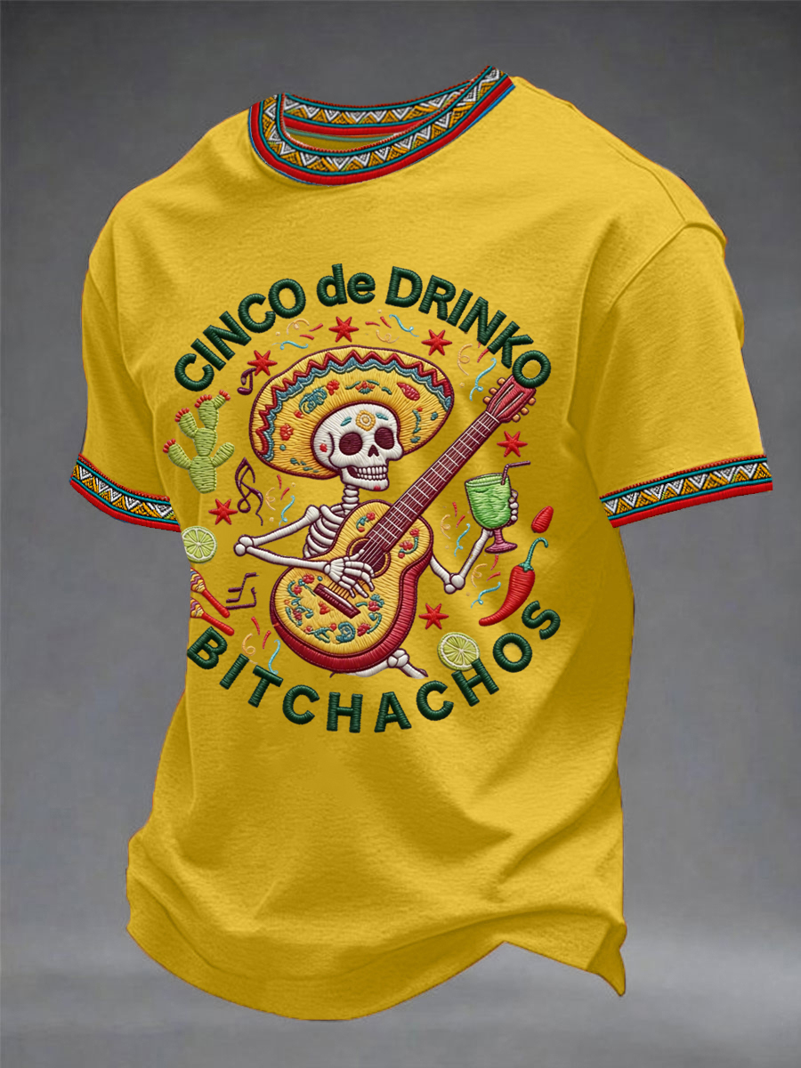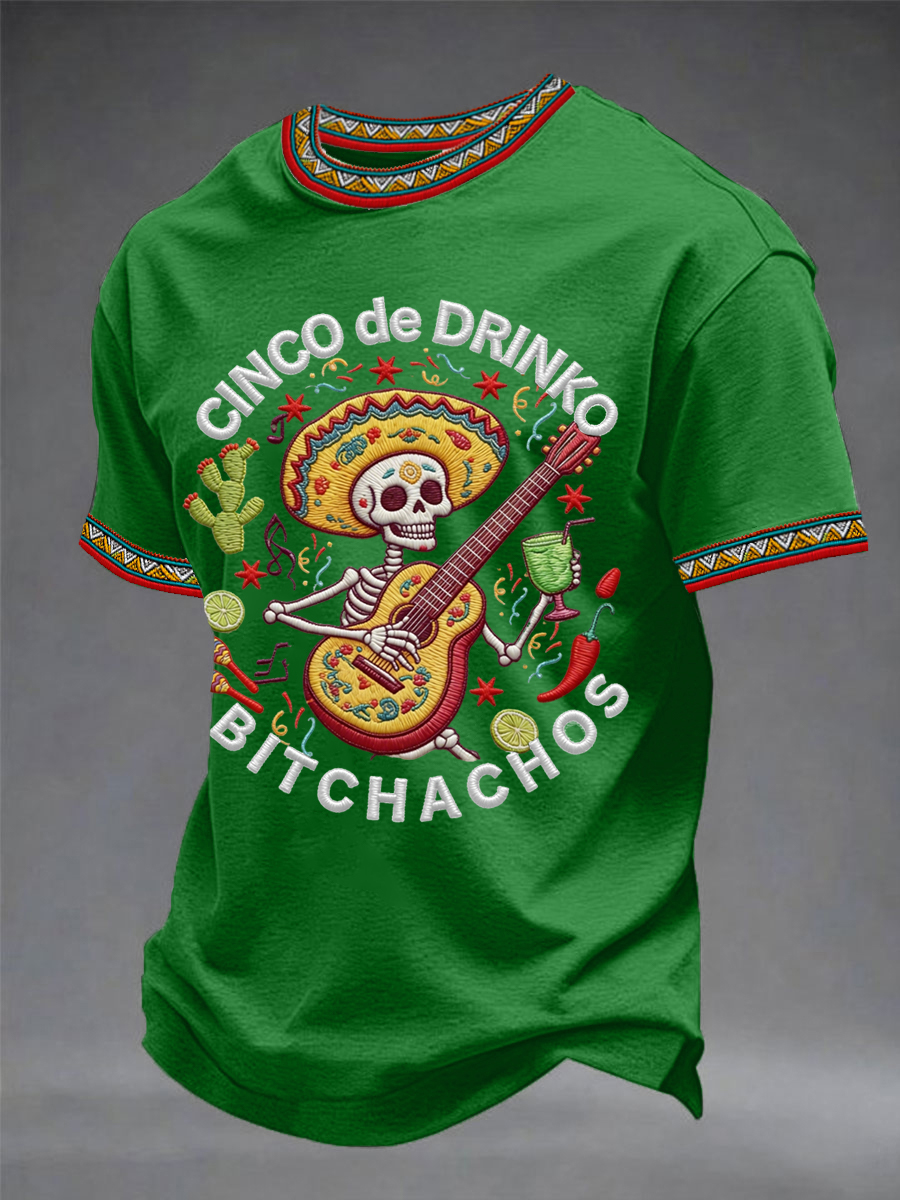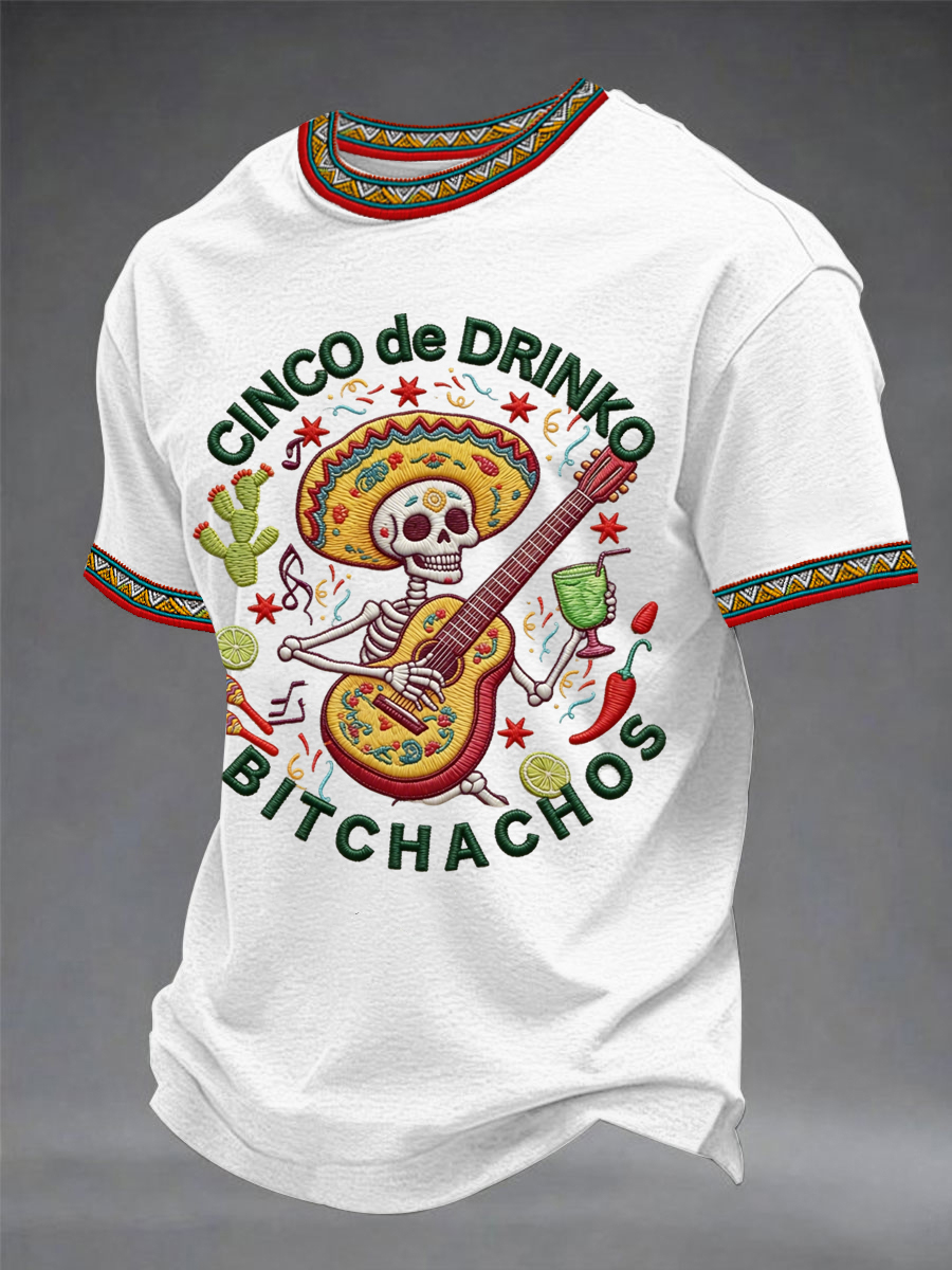 Men's Funny Cinco De Drinko Bitchachos Skeleton Print Casual Short-Sleeve T-shirt