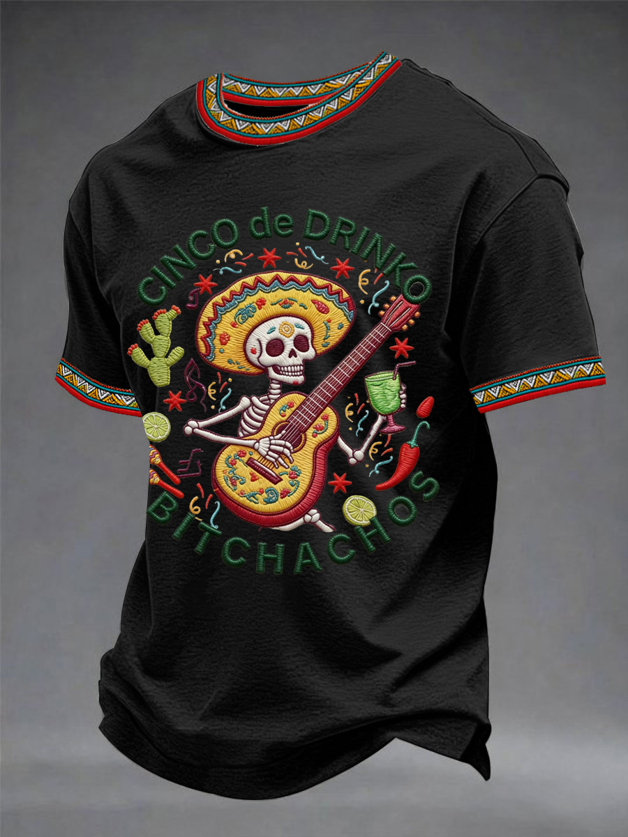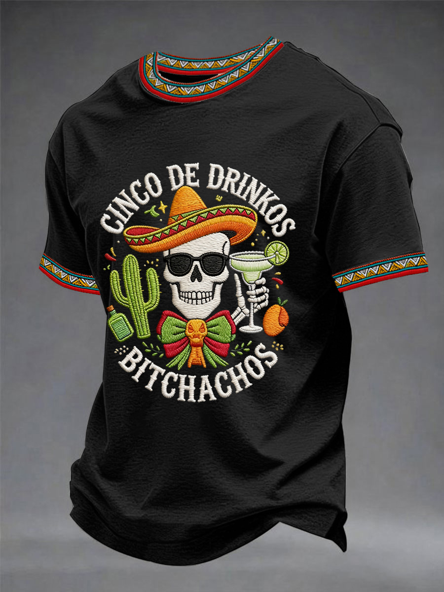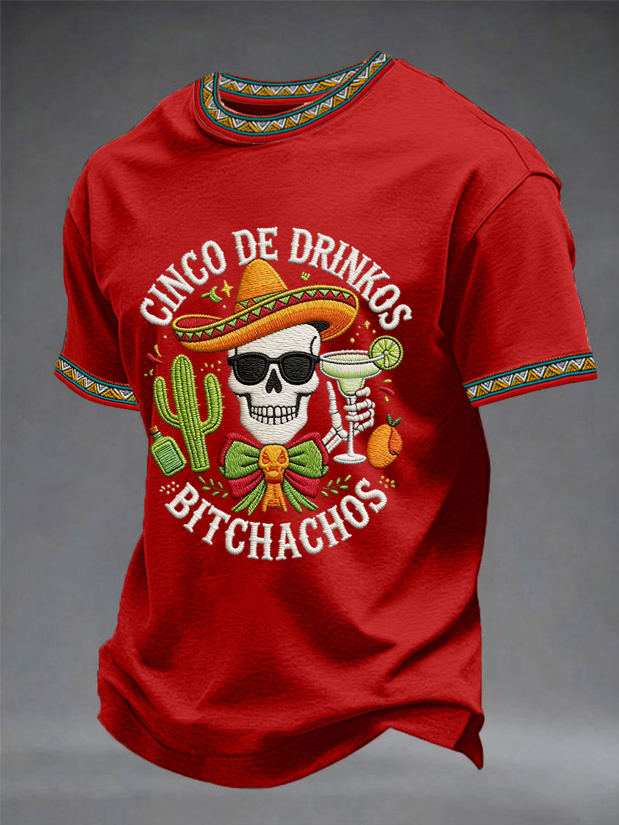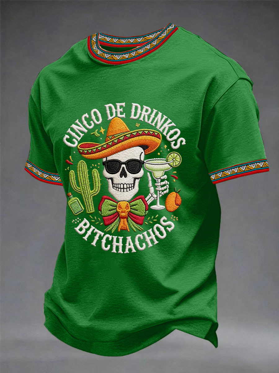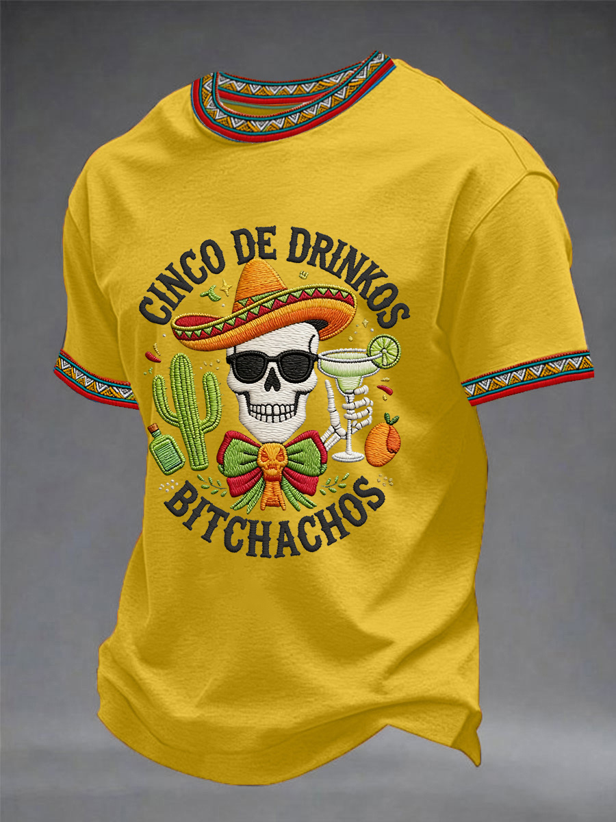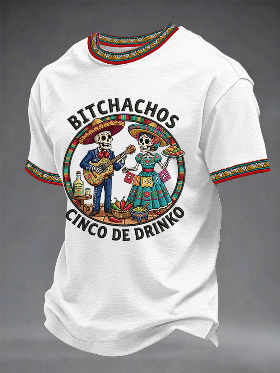 Men's Funny Cinco De Drinko Bitchachos Skeleton Print Casual Short-Sleeve T-shirt