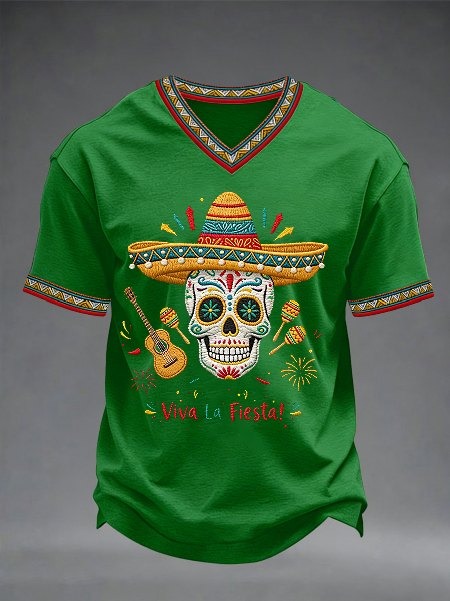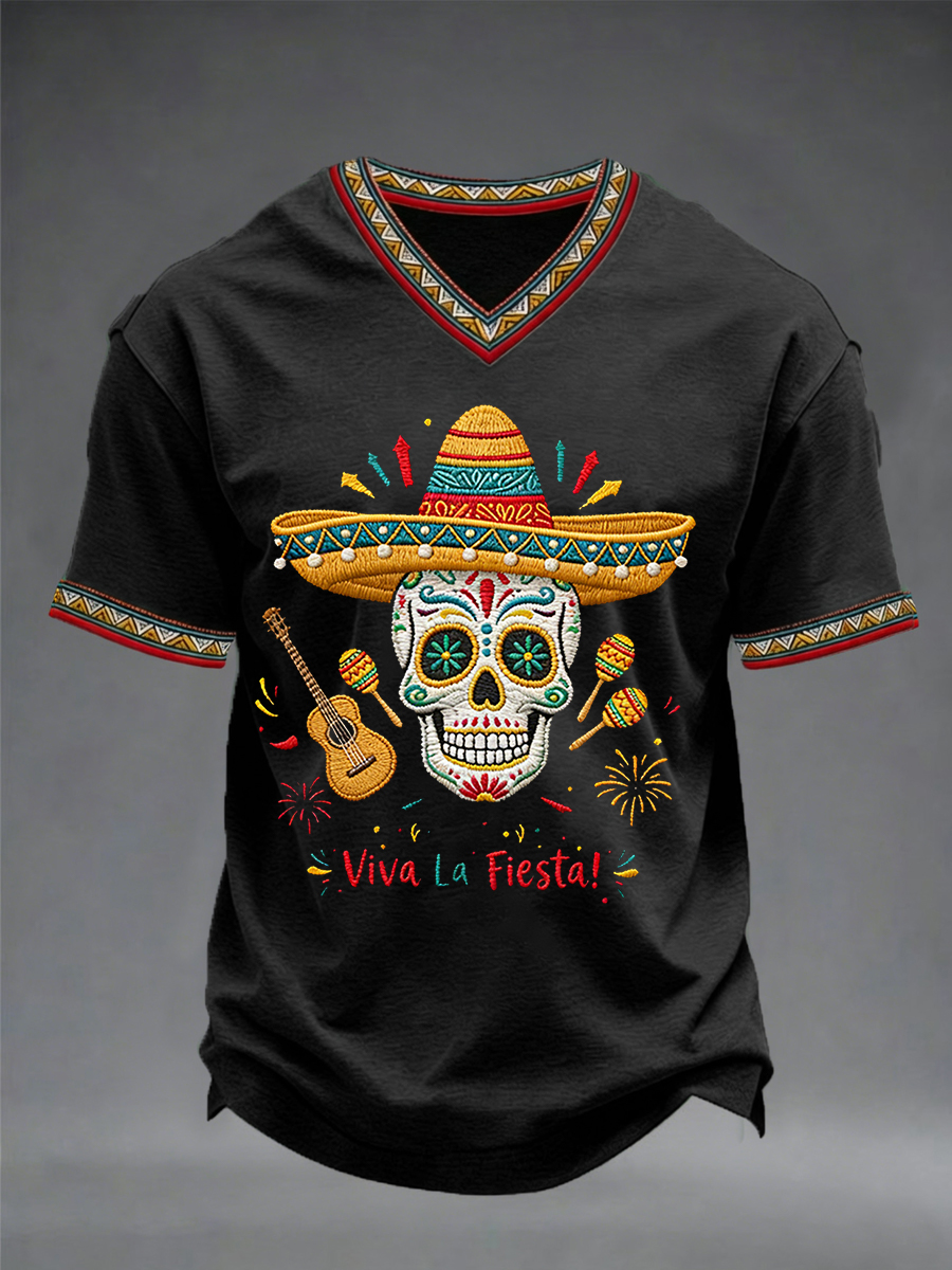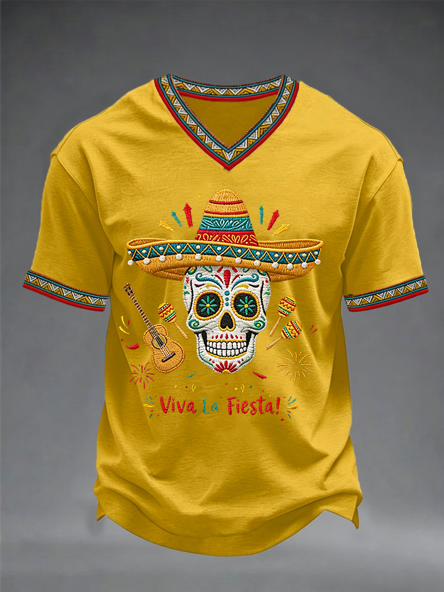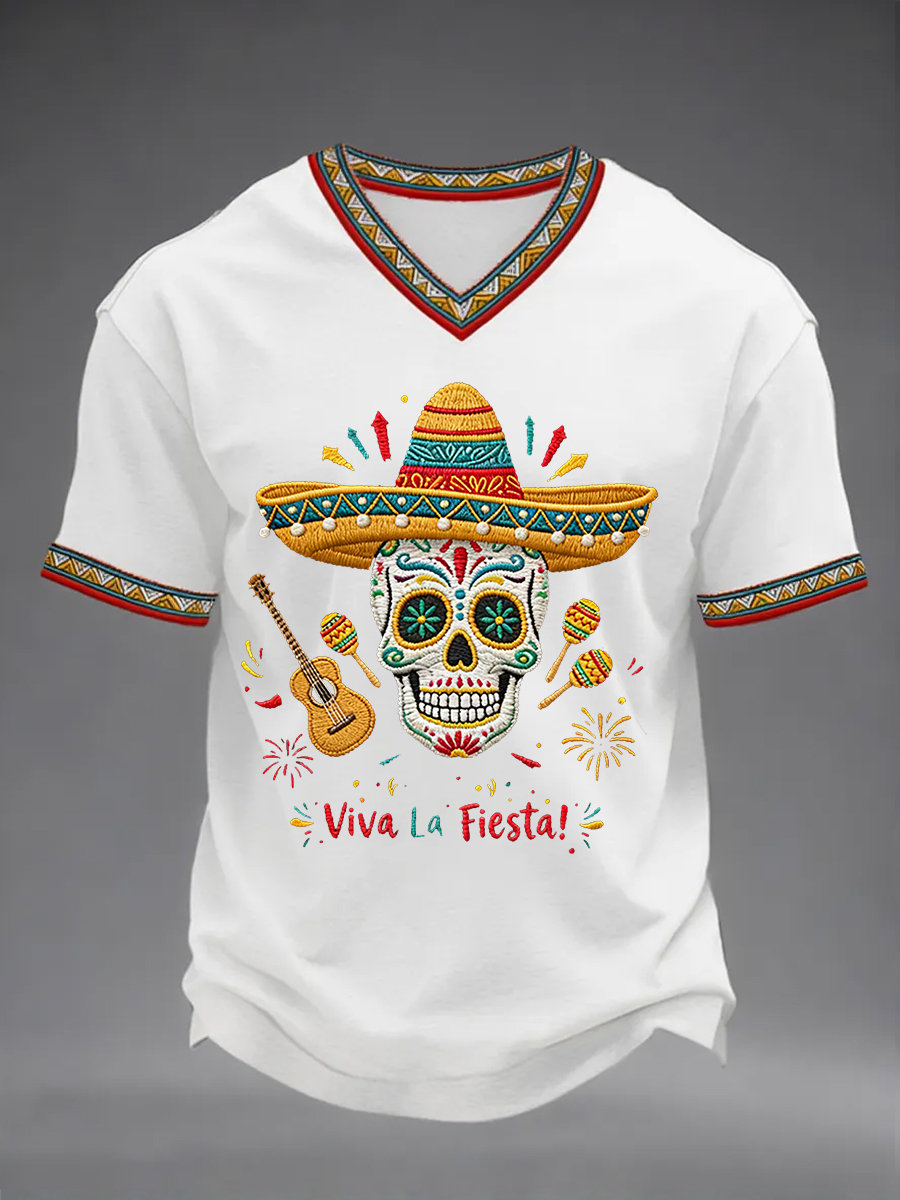 Men's Viva La Fiesta! Skeleton Print Casual V-Neck Tee
