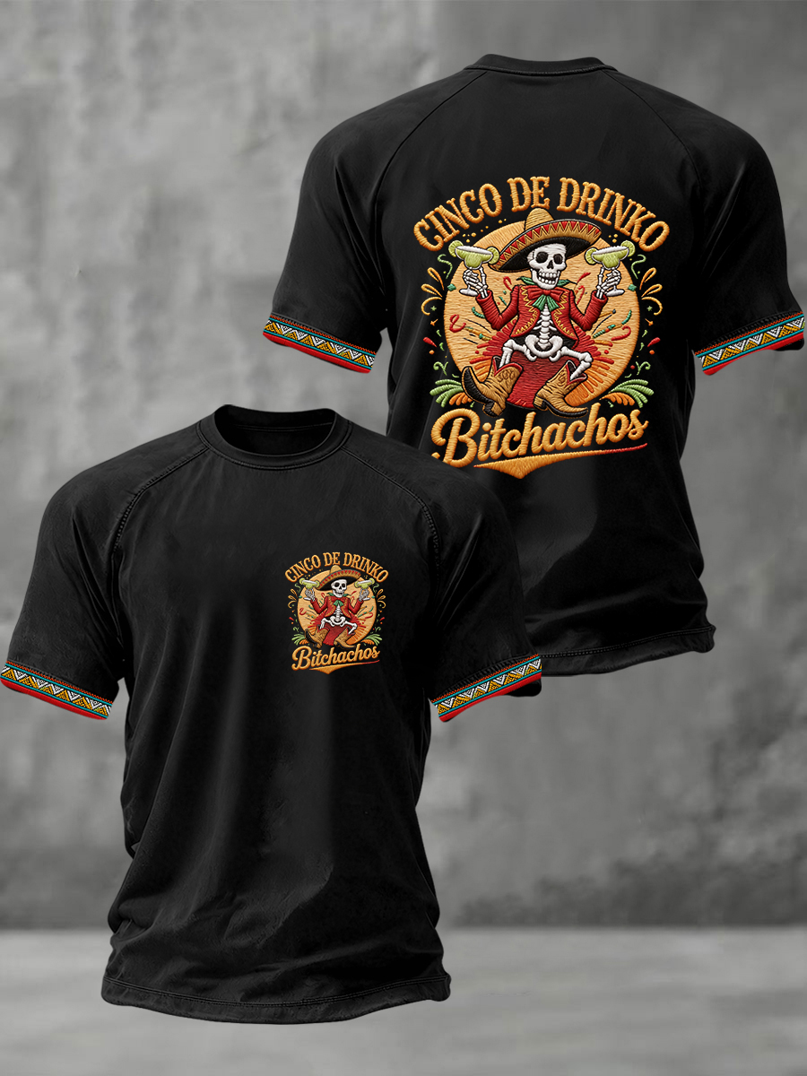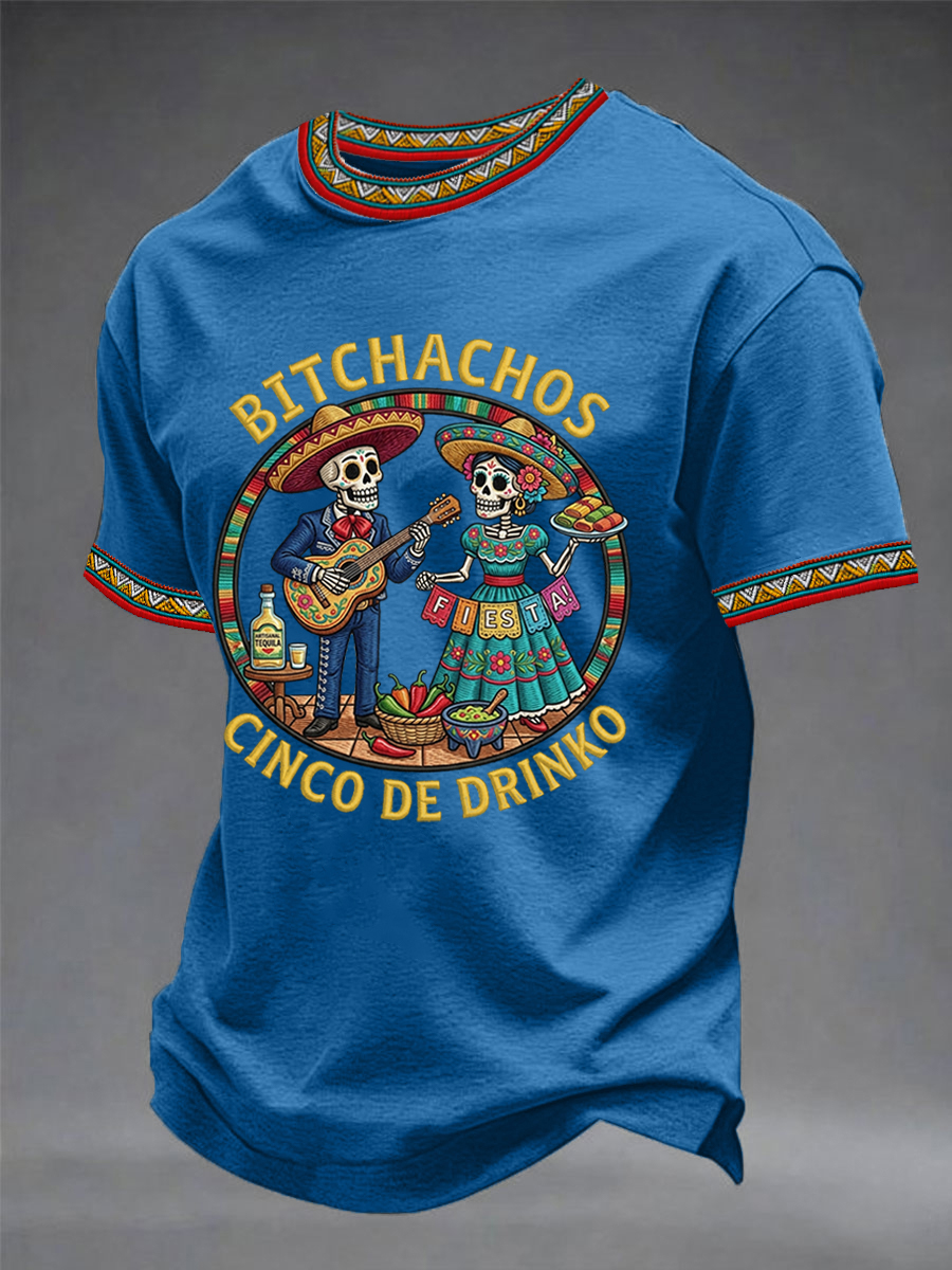 Men's Funny Cinco De Drinko Bitchachos Skeleton Print Casual Tee
