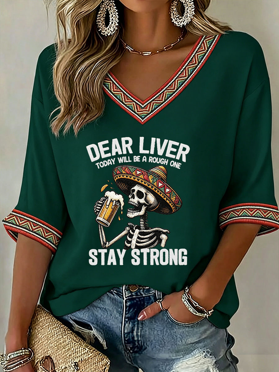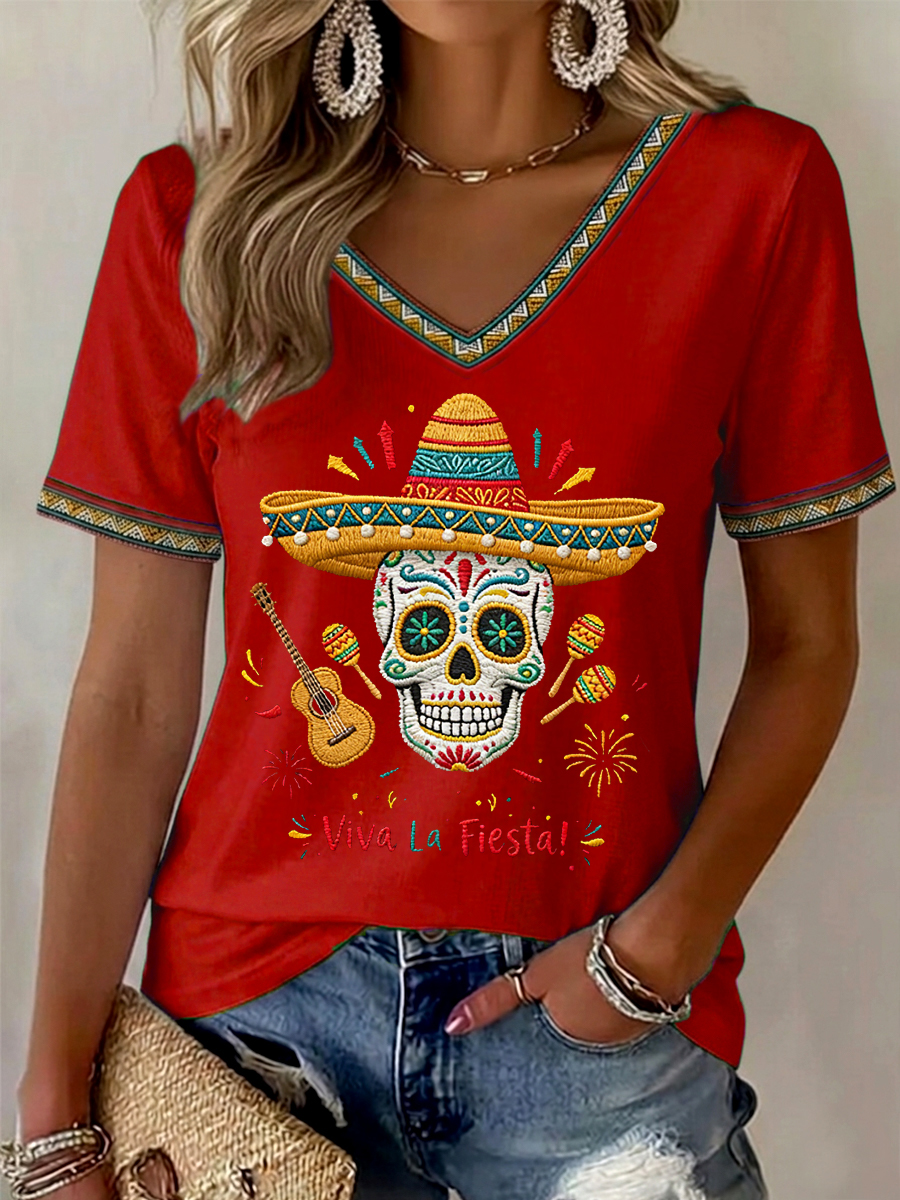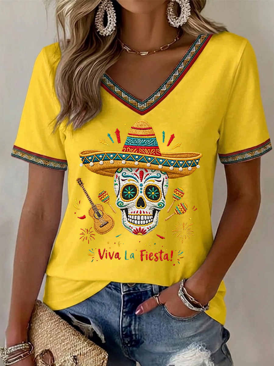 Women's Viva La Fiesta! Skeleton Print Casual V-Neck Tee