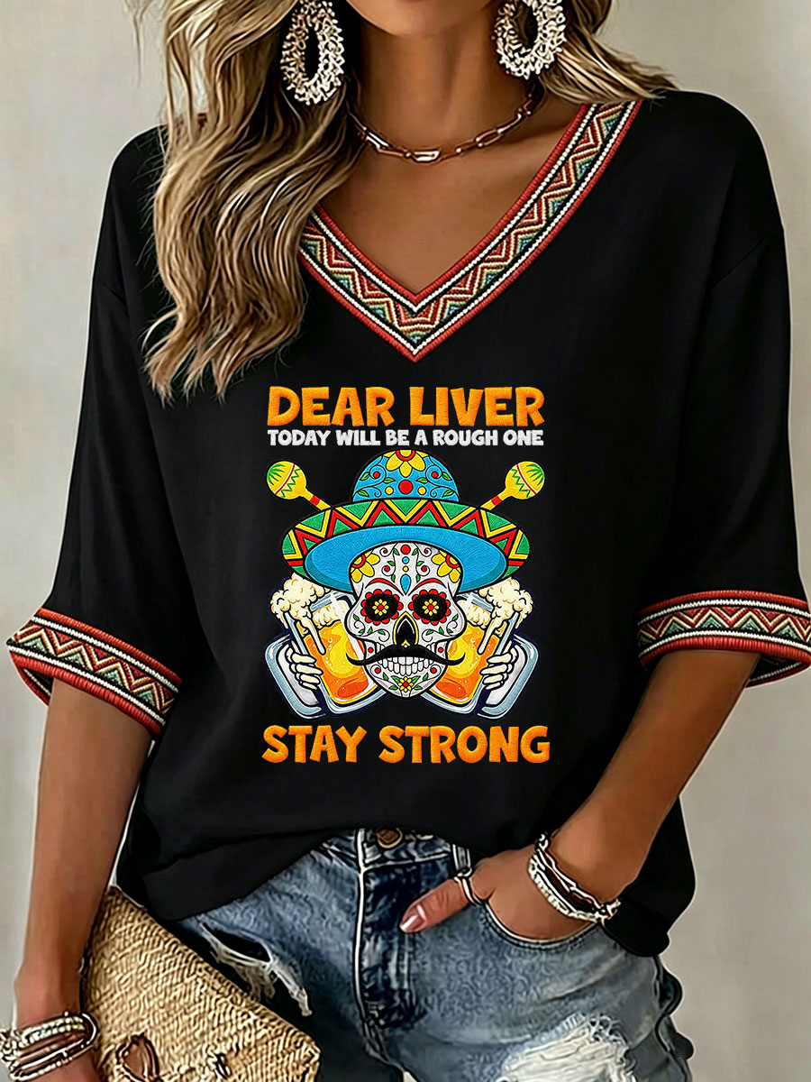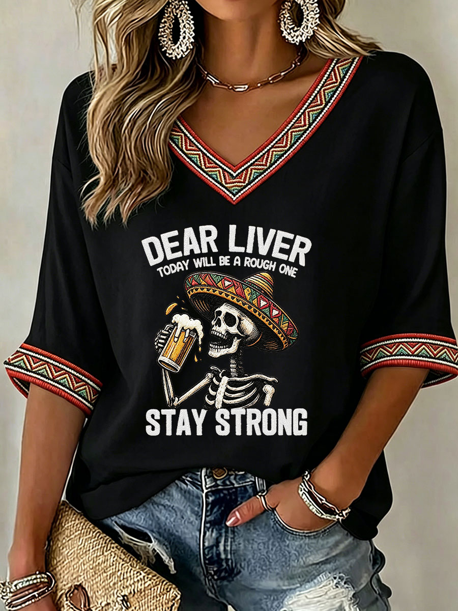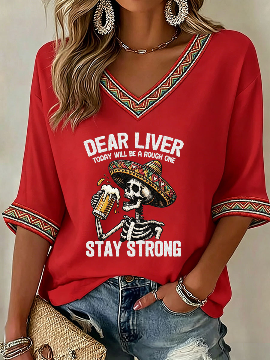 Women's Viva La Fiesta! Skeleton Print Casual V-Neck Tee