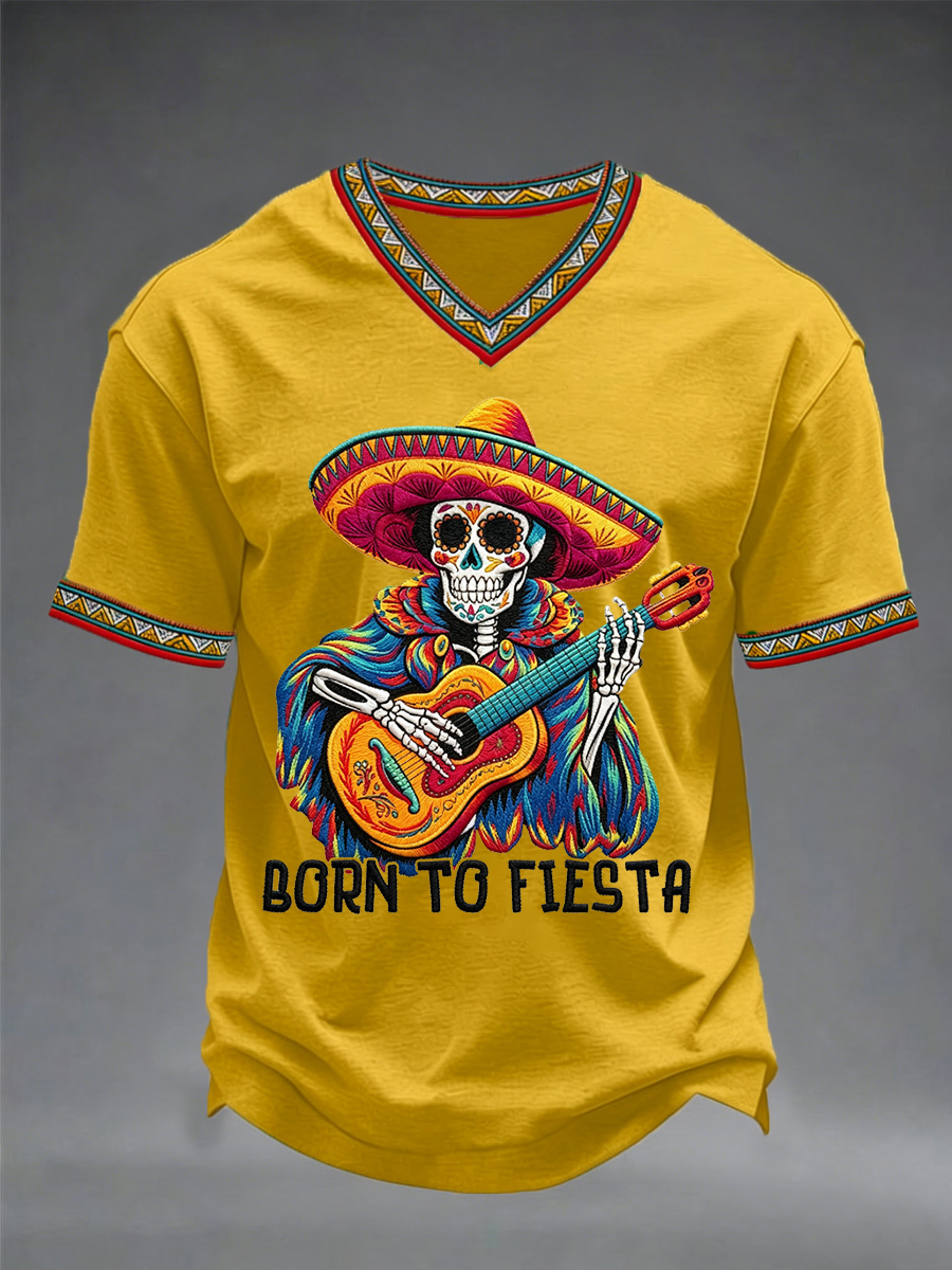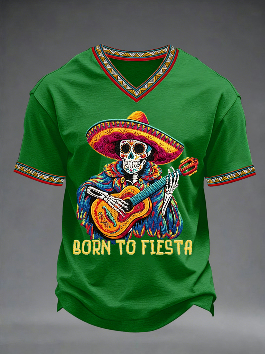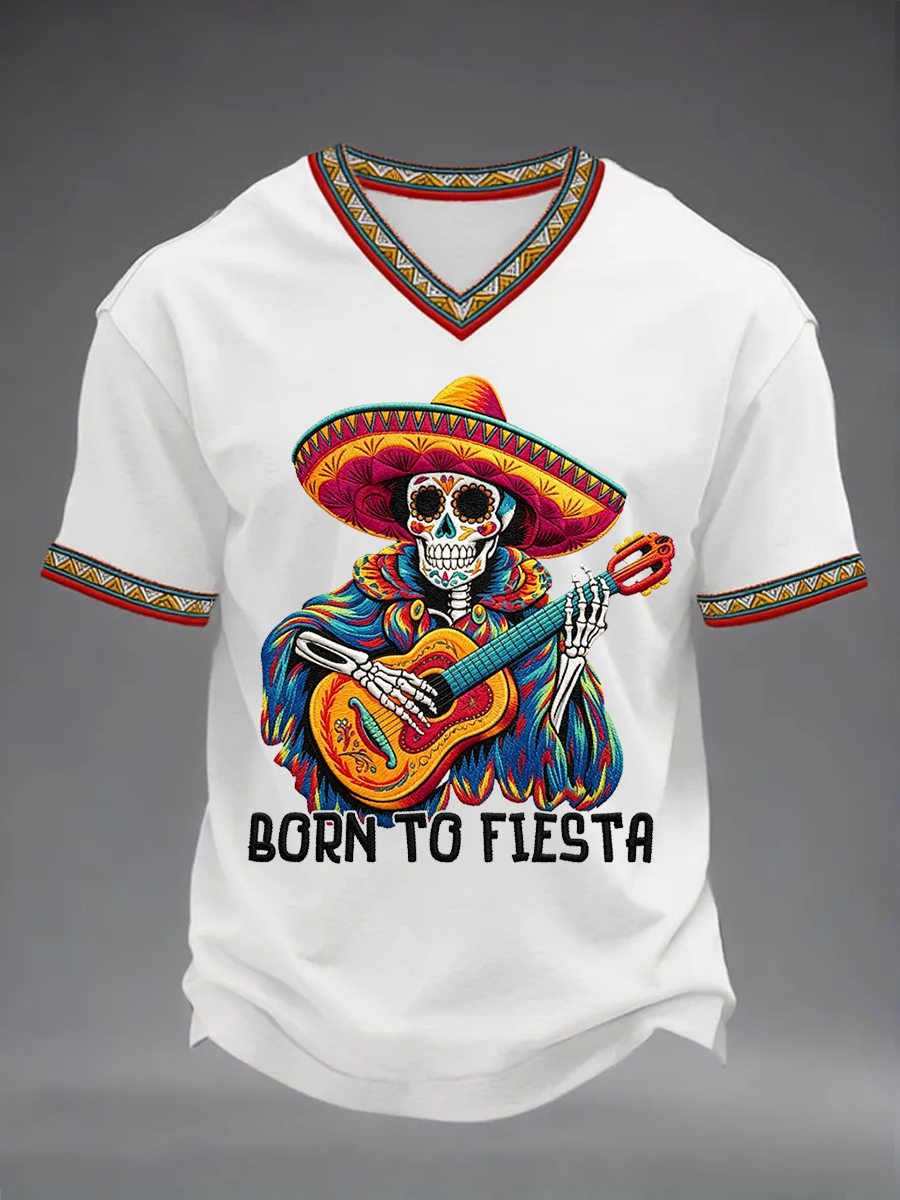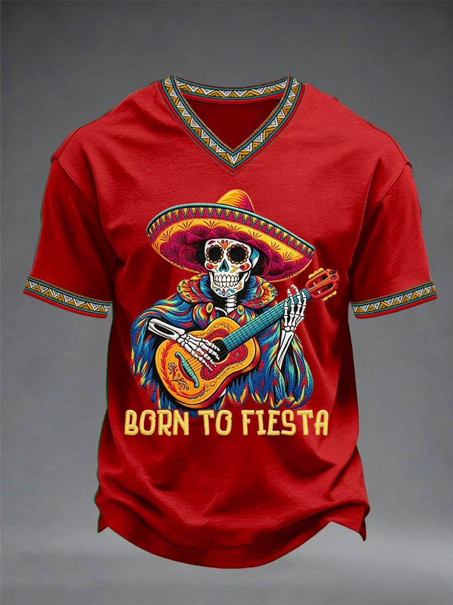 Men's Born To Fiesta Skeleton Print Casual V-Neack Tee