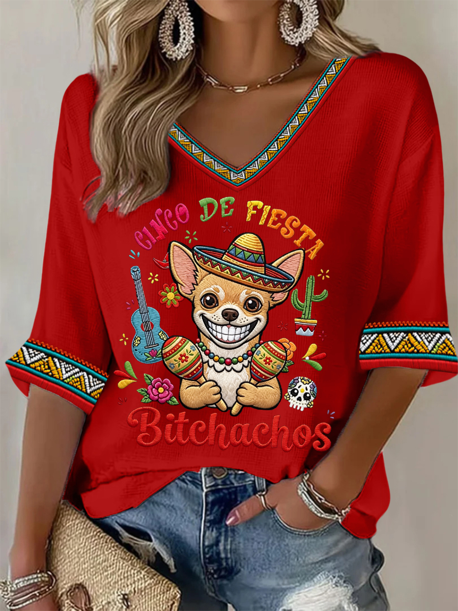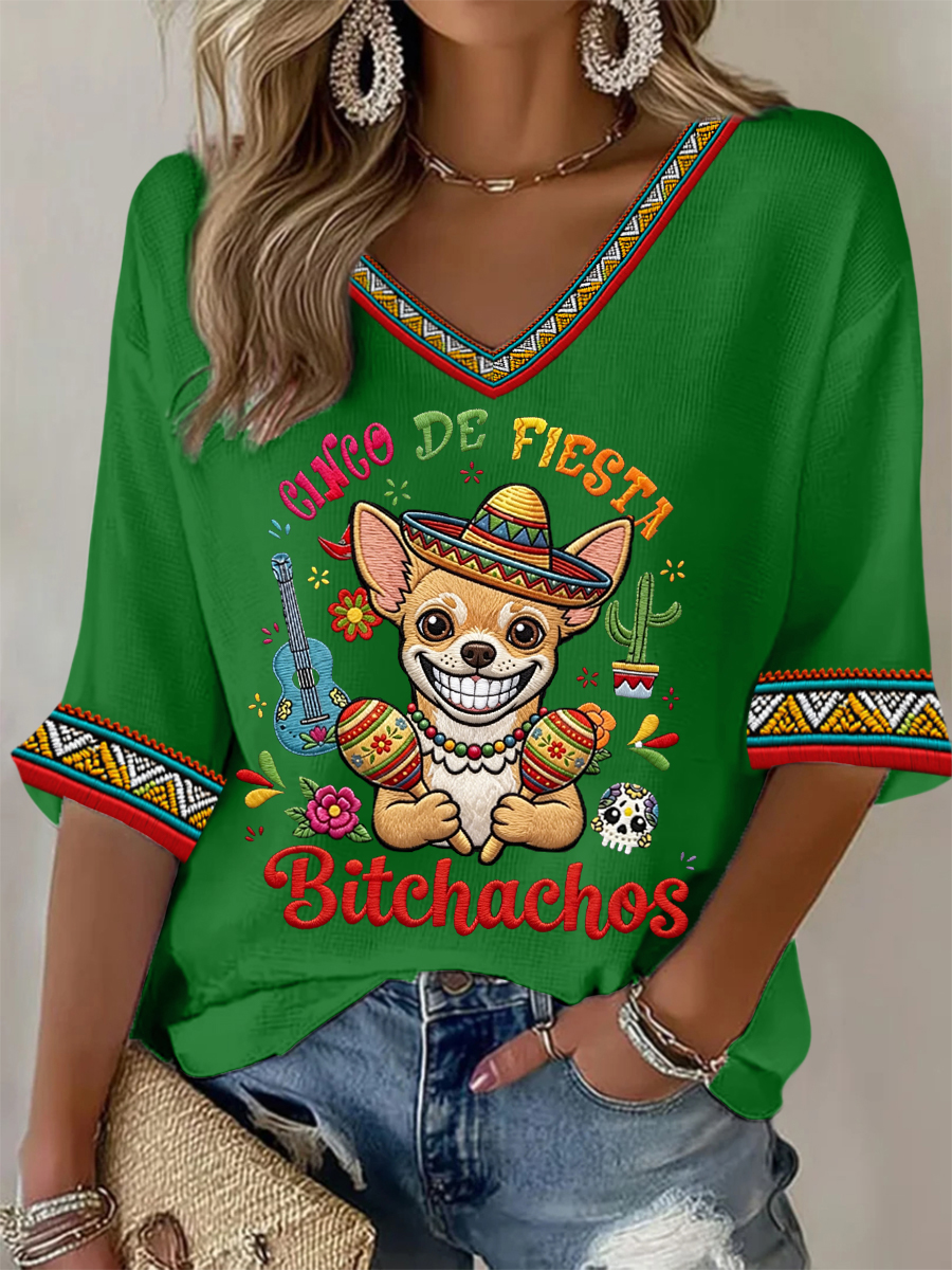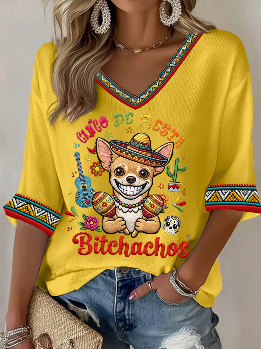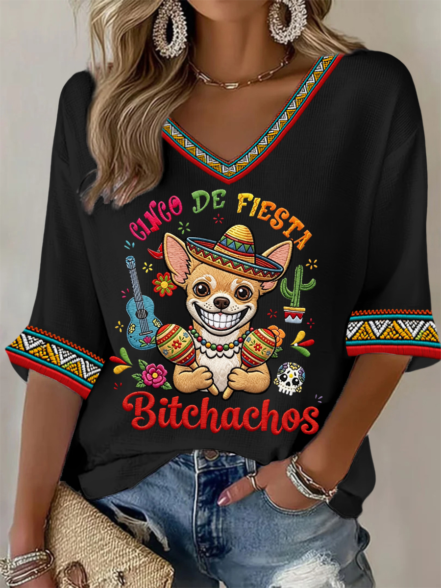 Women's Funny Cinco De Fiesta Bitchachos Dog Print Casual Waffle T-shirt