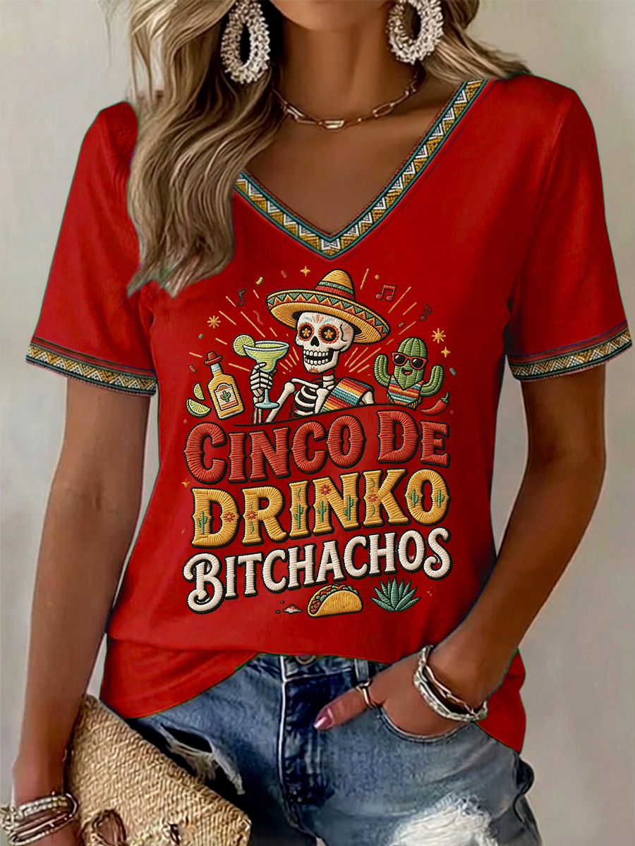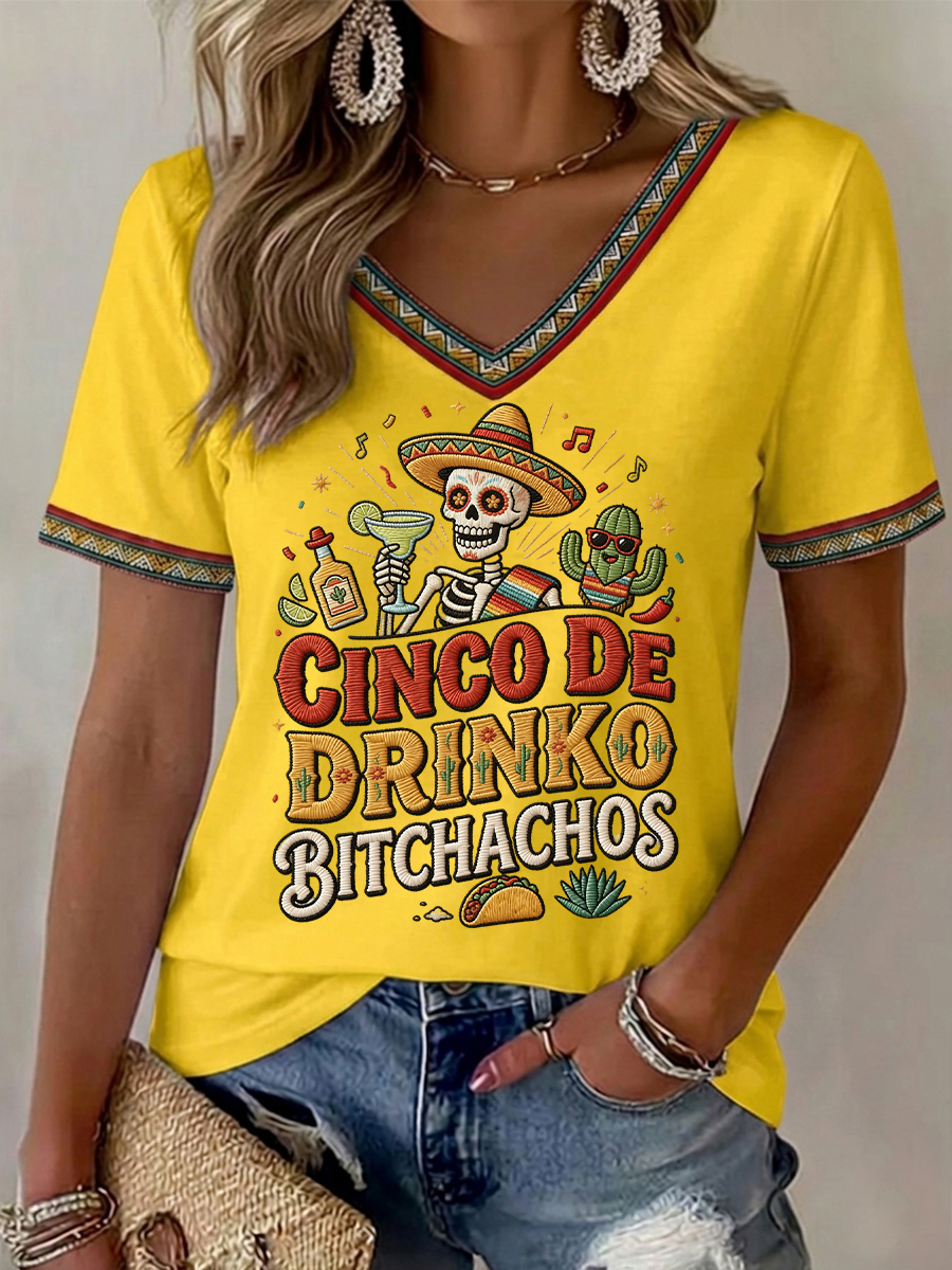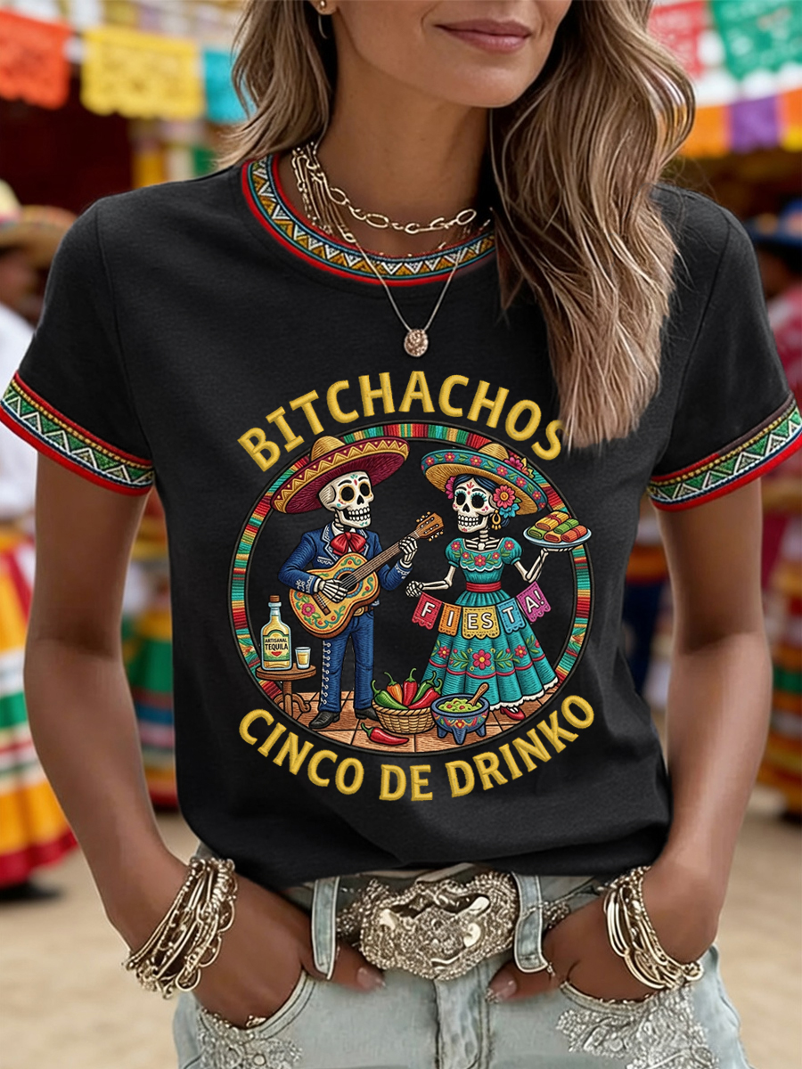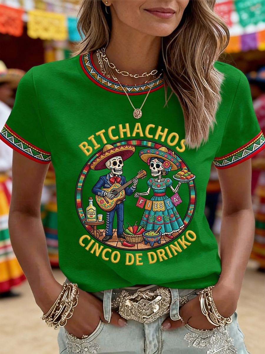 Women's Funny Cinco De Drinko Bitchachos Skeleton Print Casual Tee