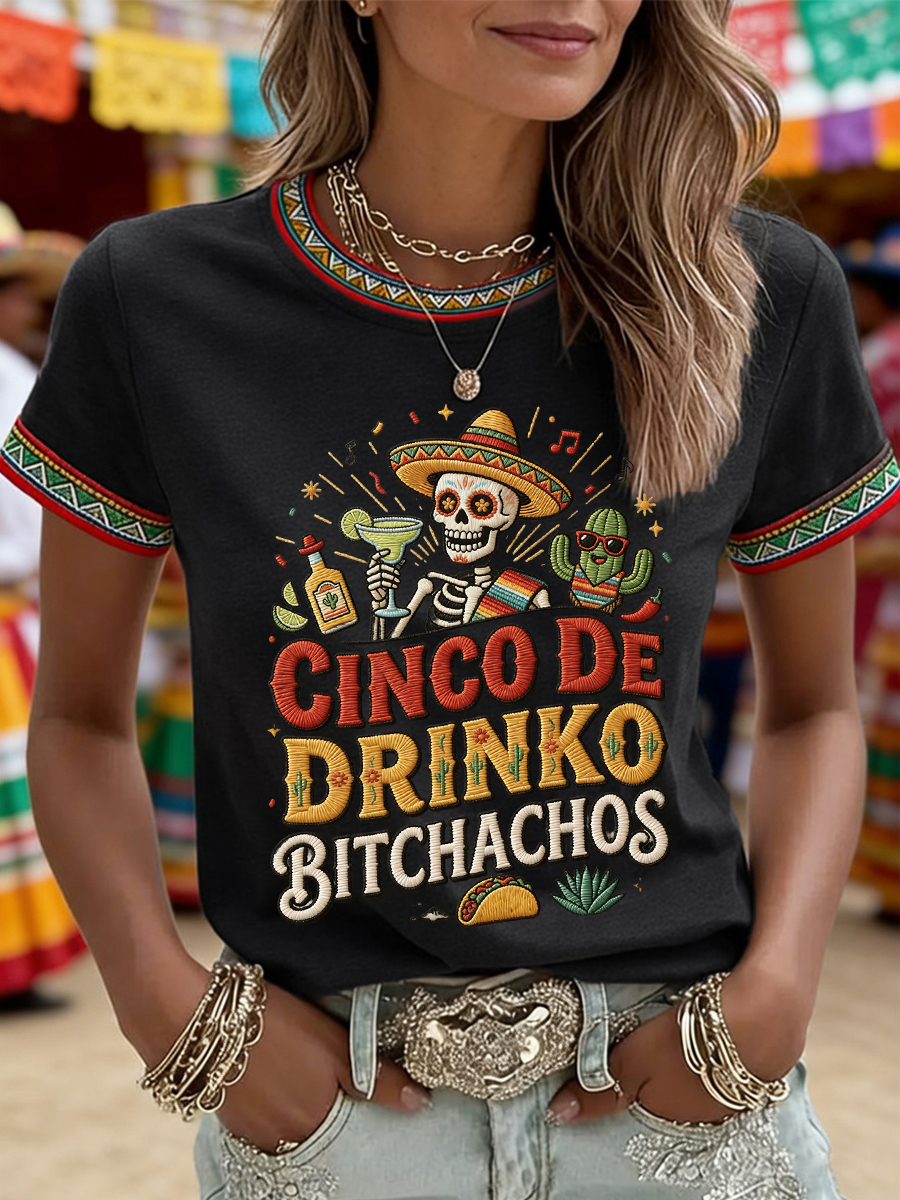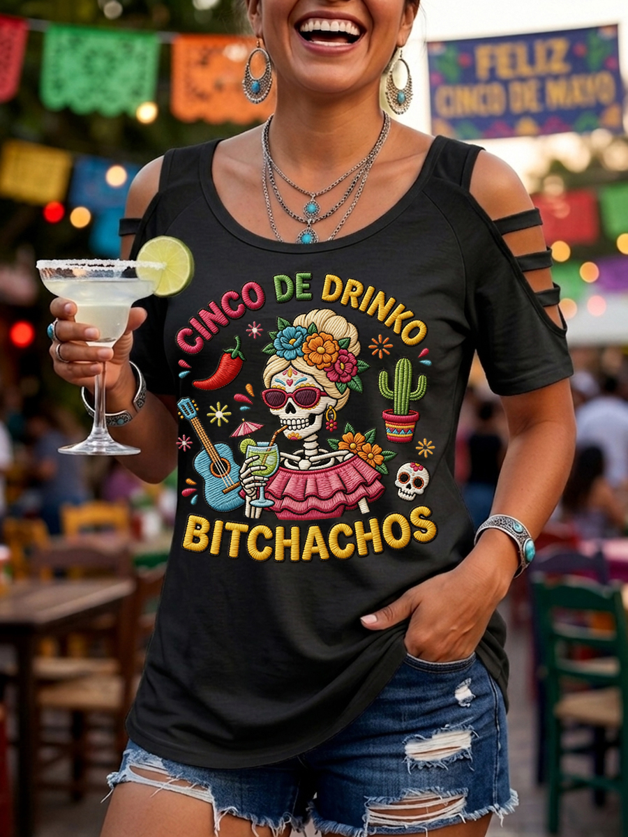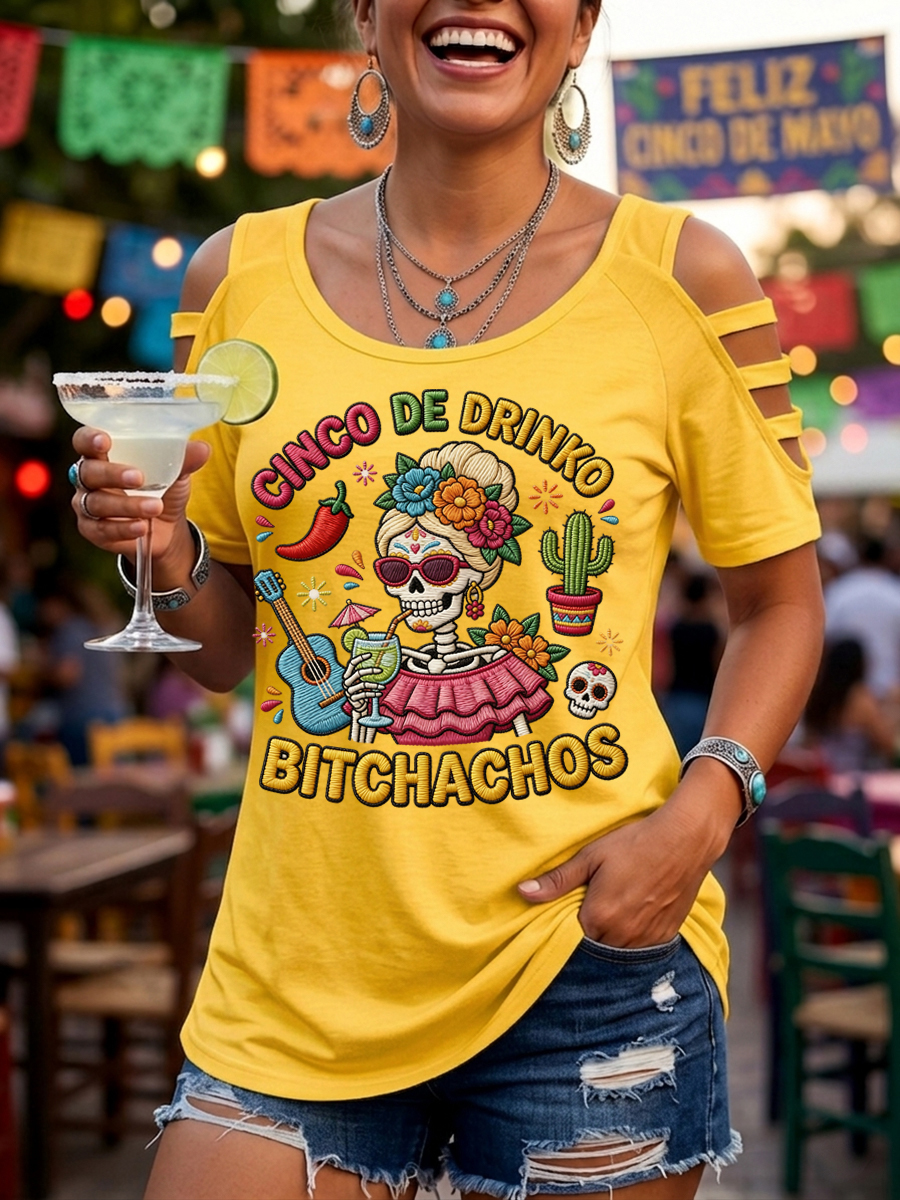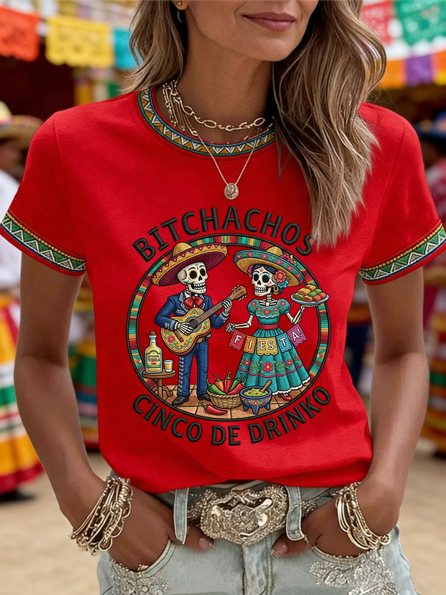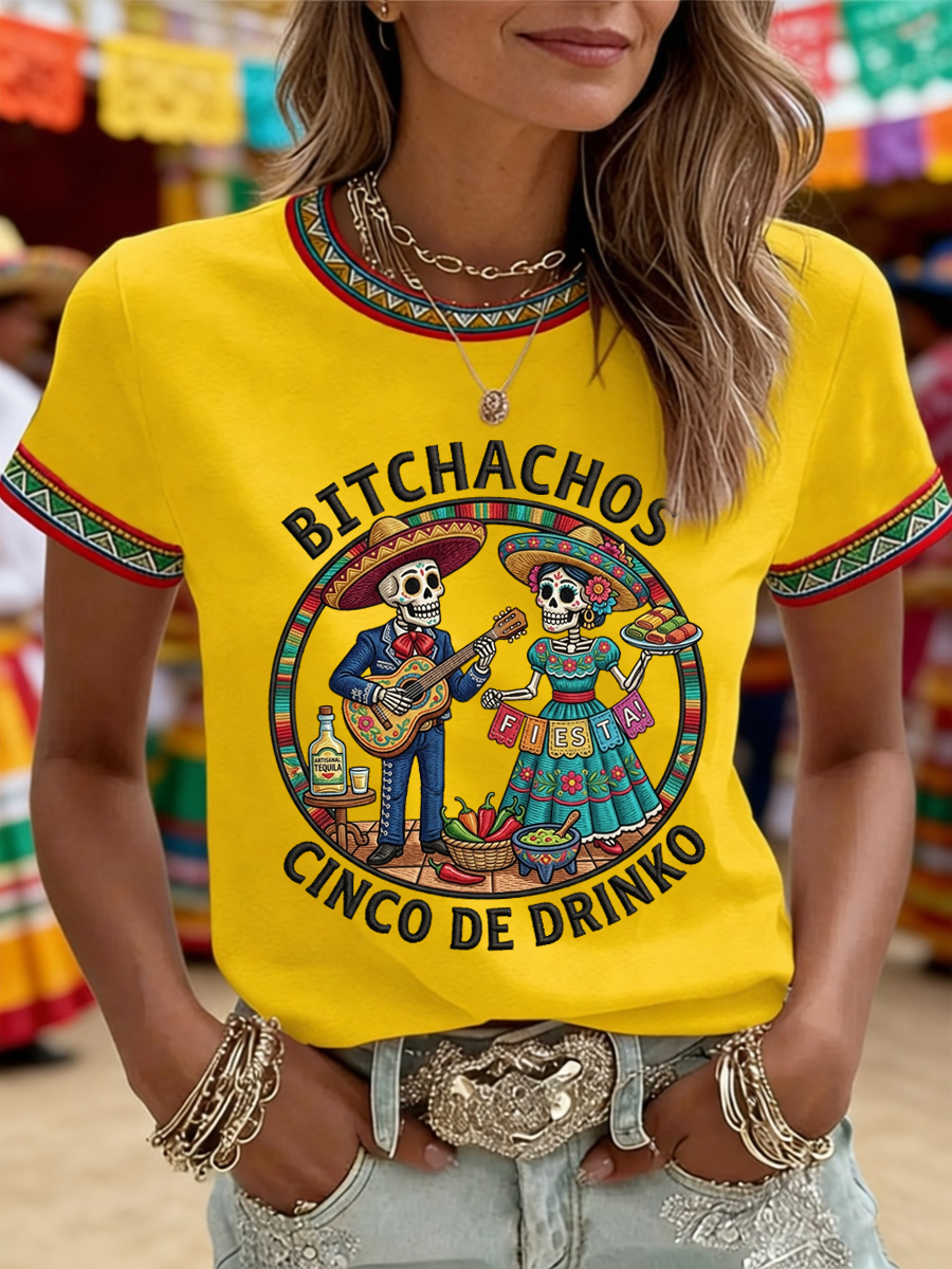 Women's Funny Cinco De Drinko Bitchachos Skeleton Print Casual Tee
