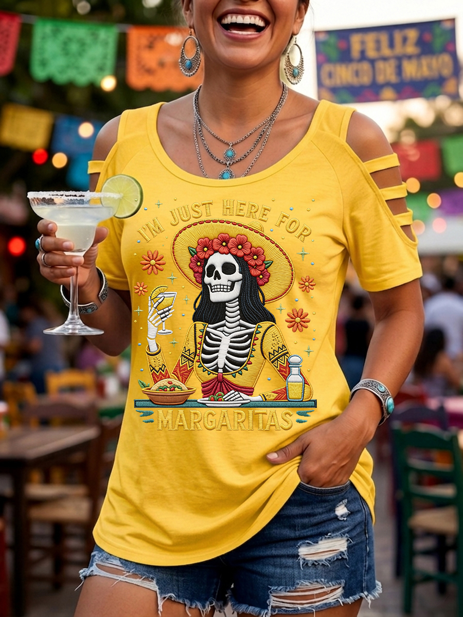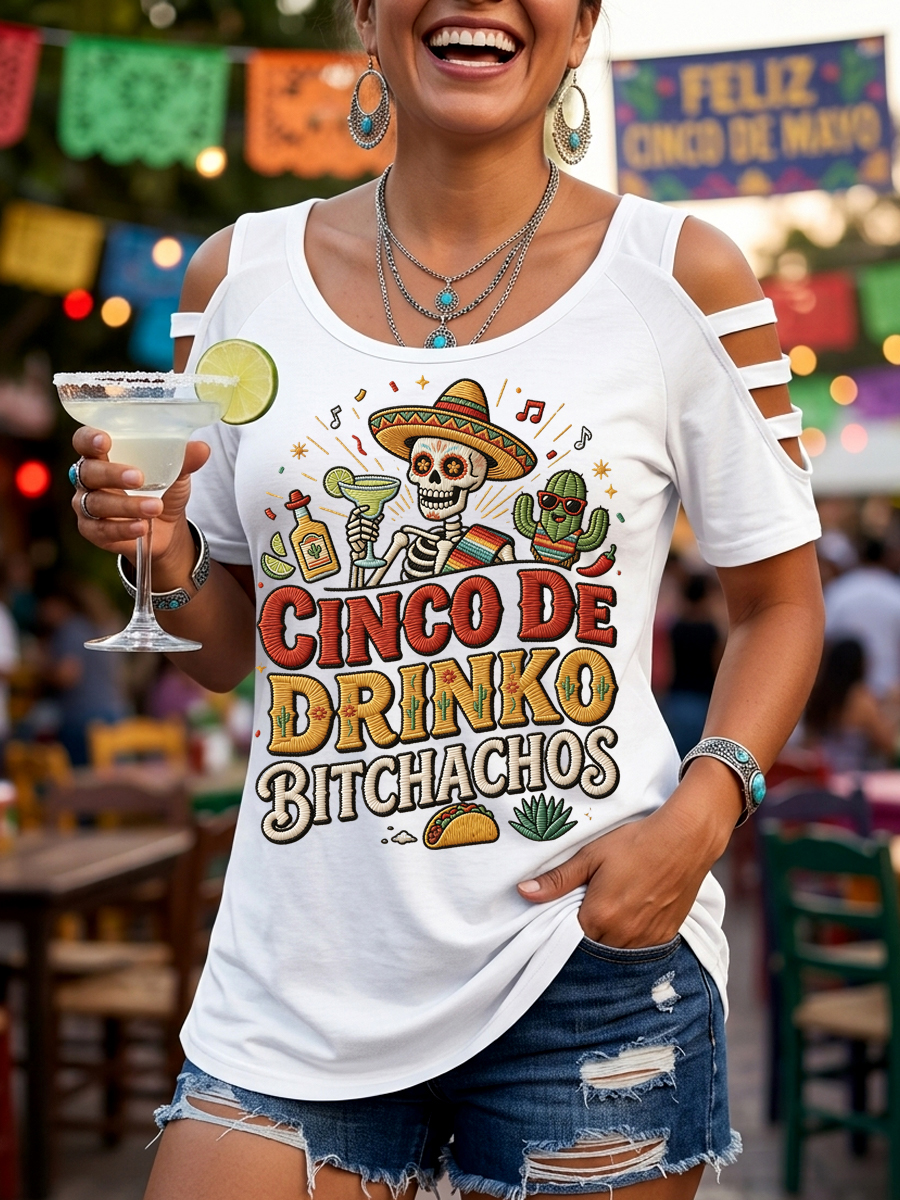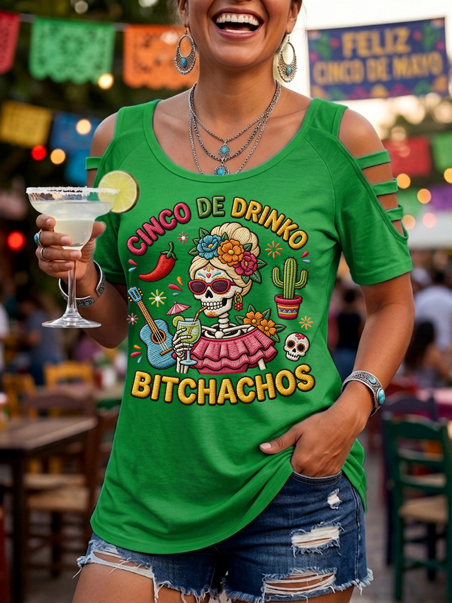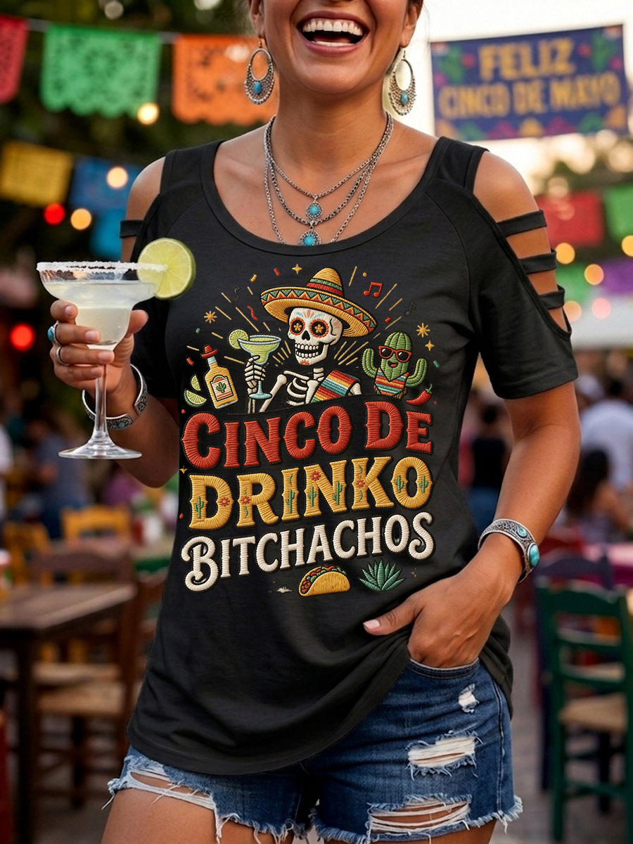 Women's Funny Cinco De Drinko Bitchachos Skeleton Print Casual Tee