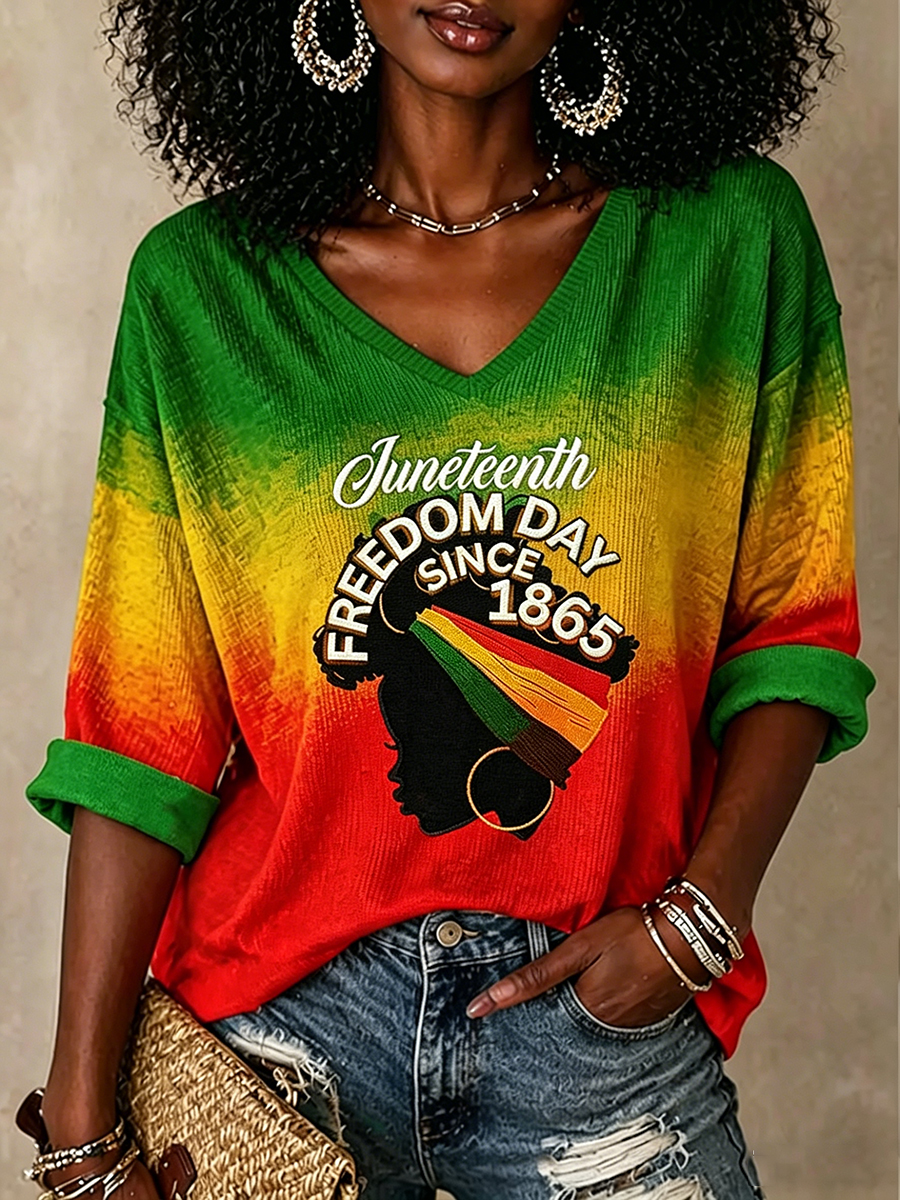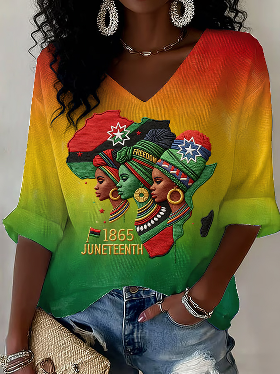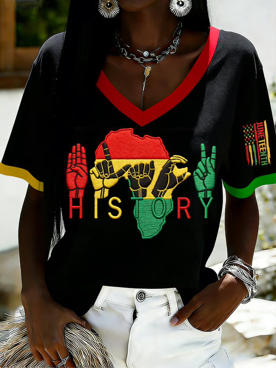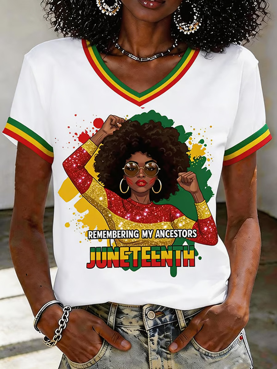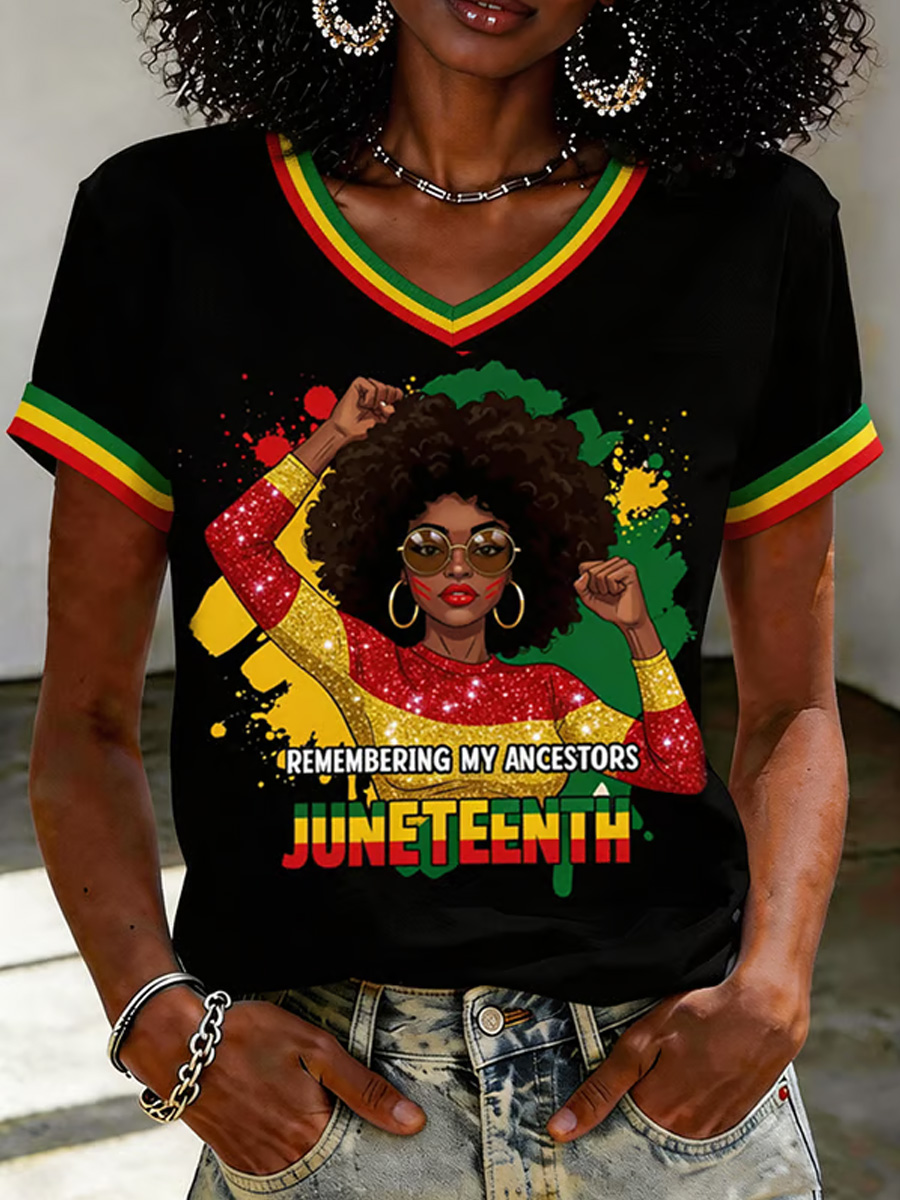 Women's Juneteenth Remebering My Ancestors Print V-Neck Tee