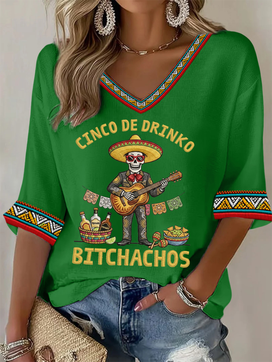 Women's Funny Cinco De Drinko Bitchachos Skeleton Print Casual Waffle Top
